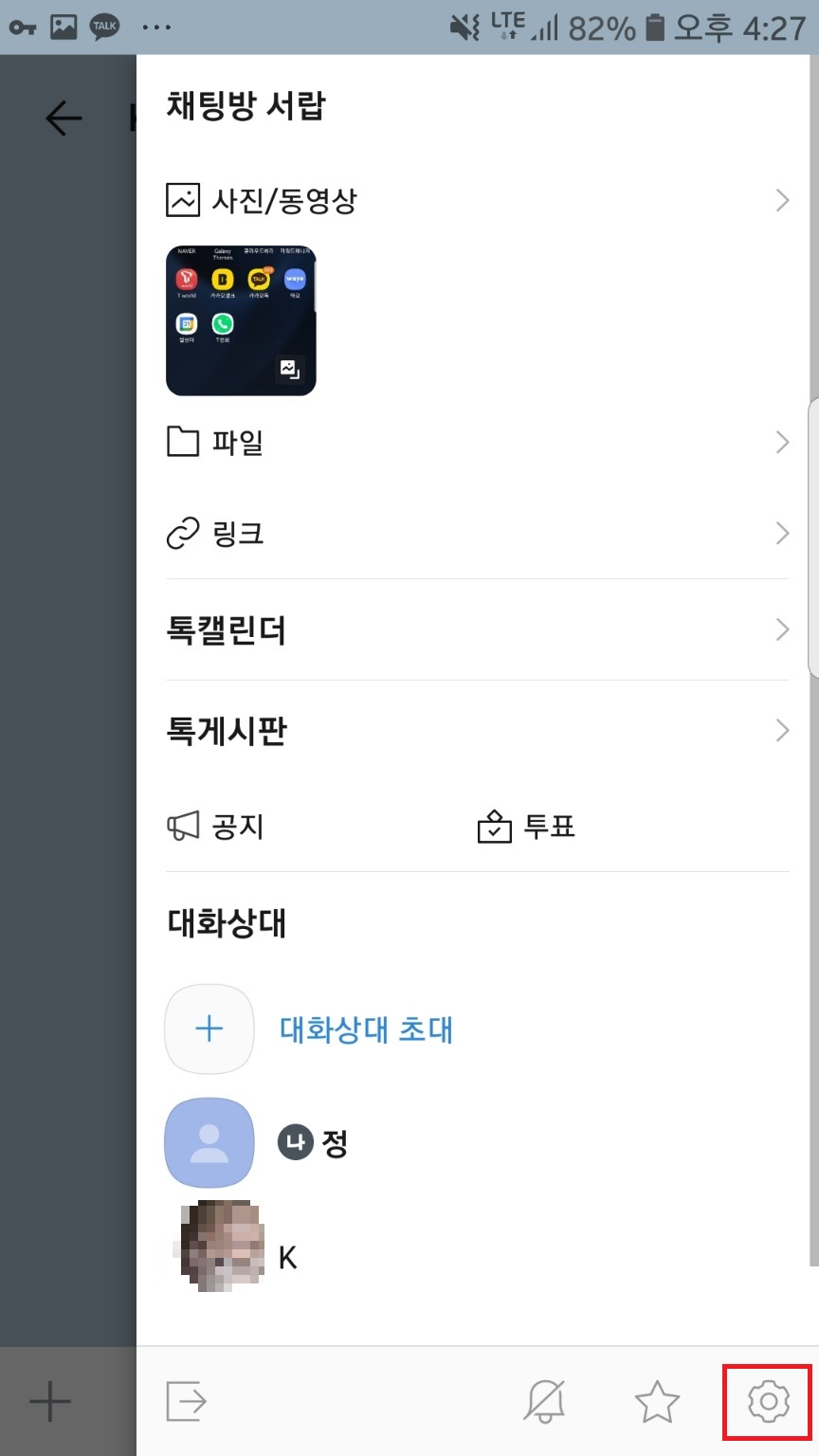 채팅방 선택 ▶우측 상단 선 세개