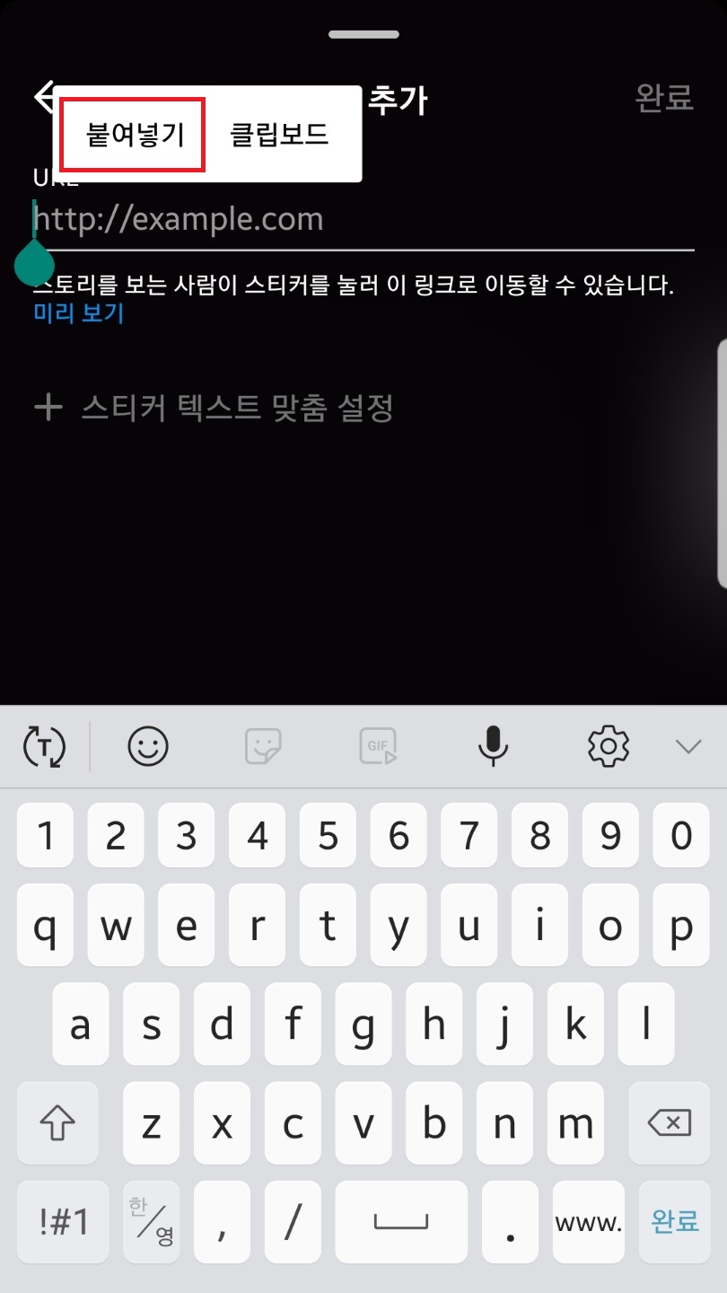링크 넣기▶스티커 텍스트 맞춤 설정▶텍스트 입력▶완료