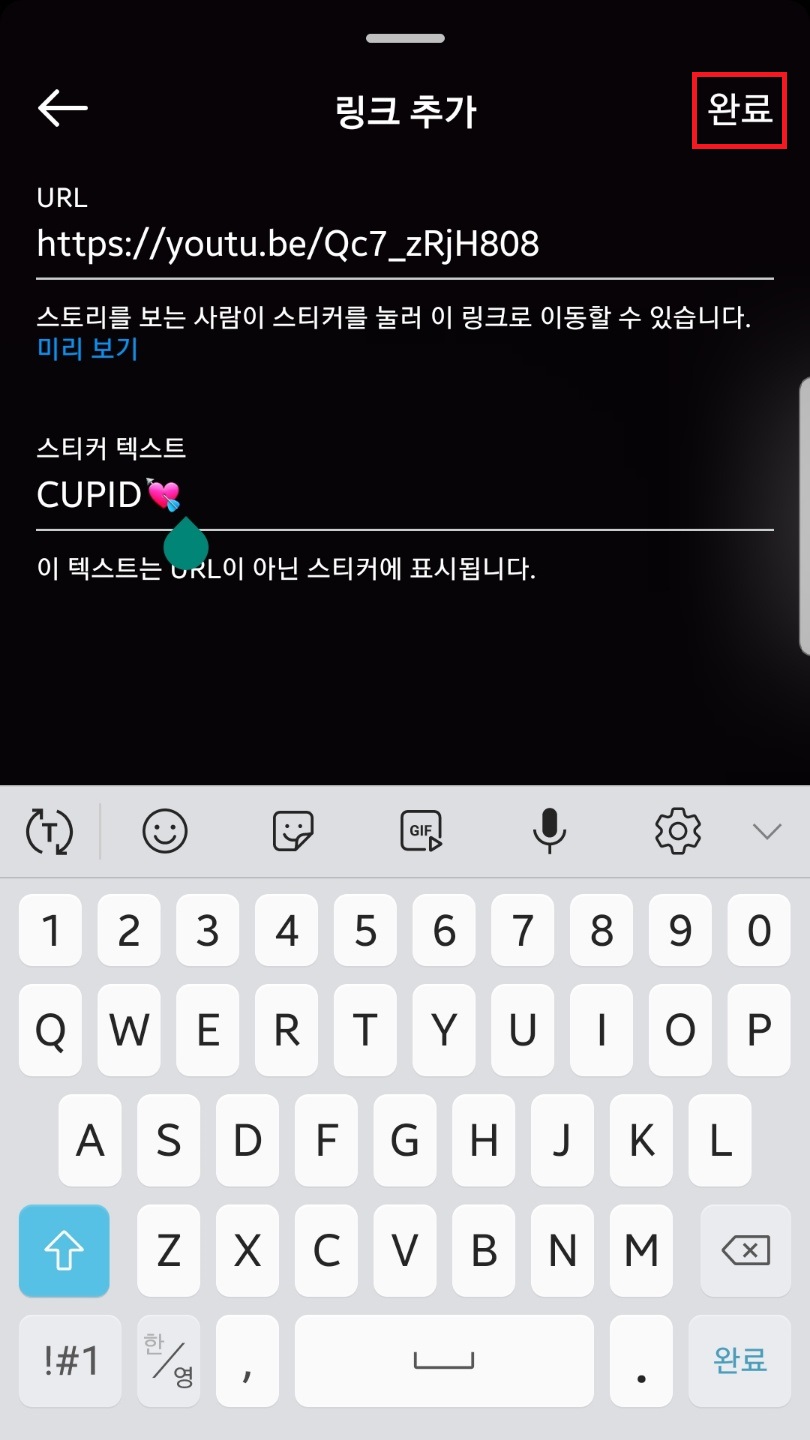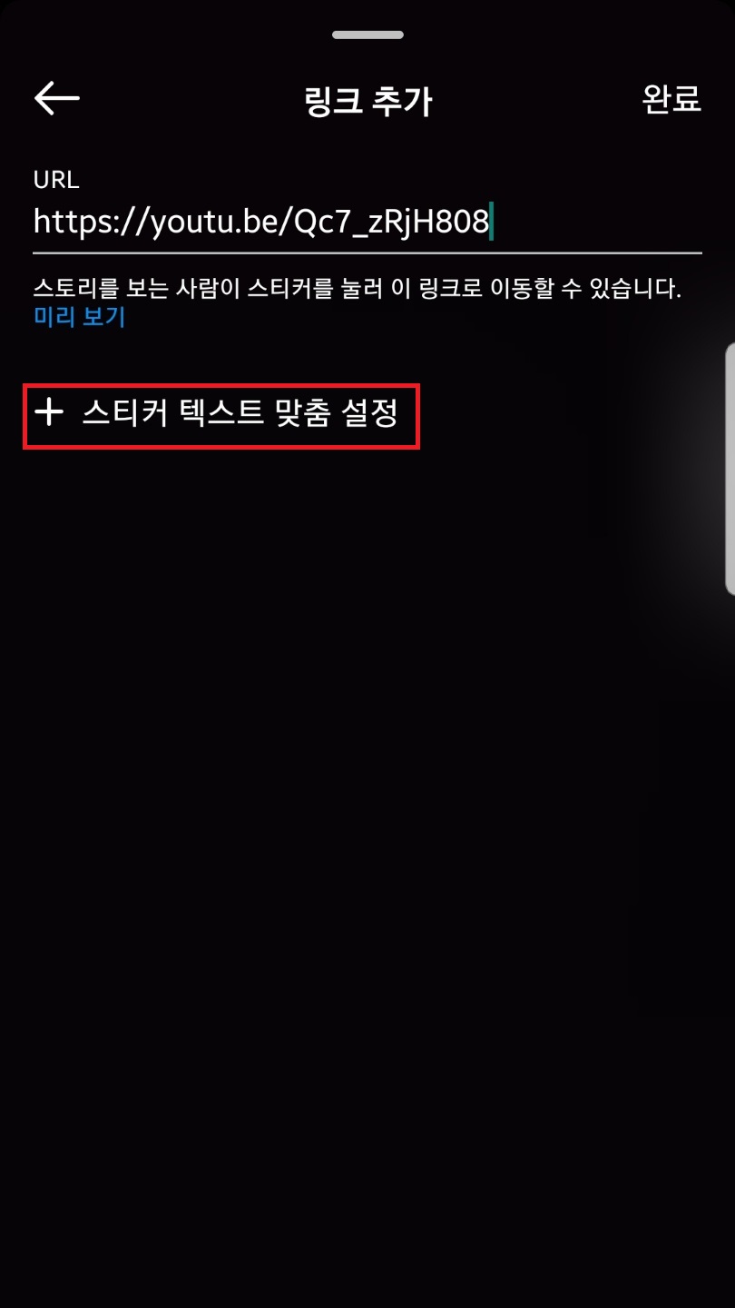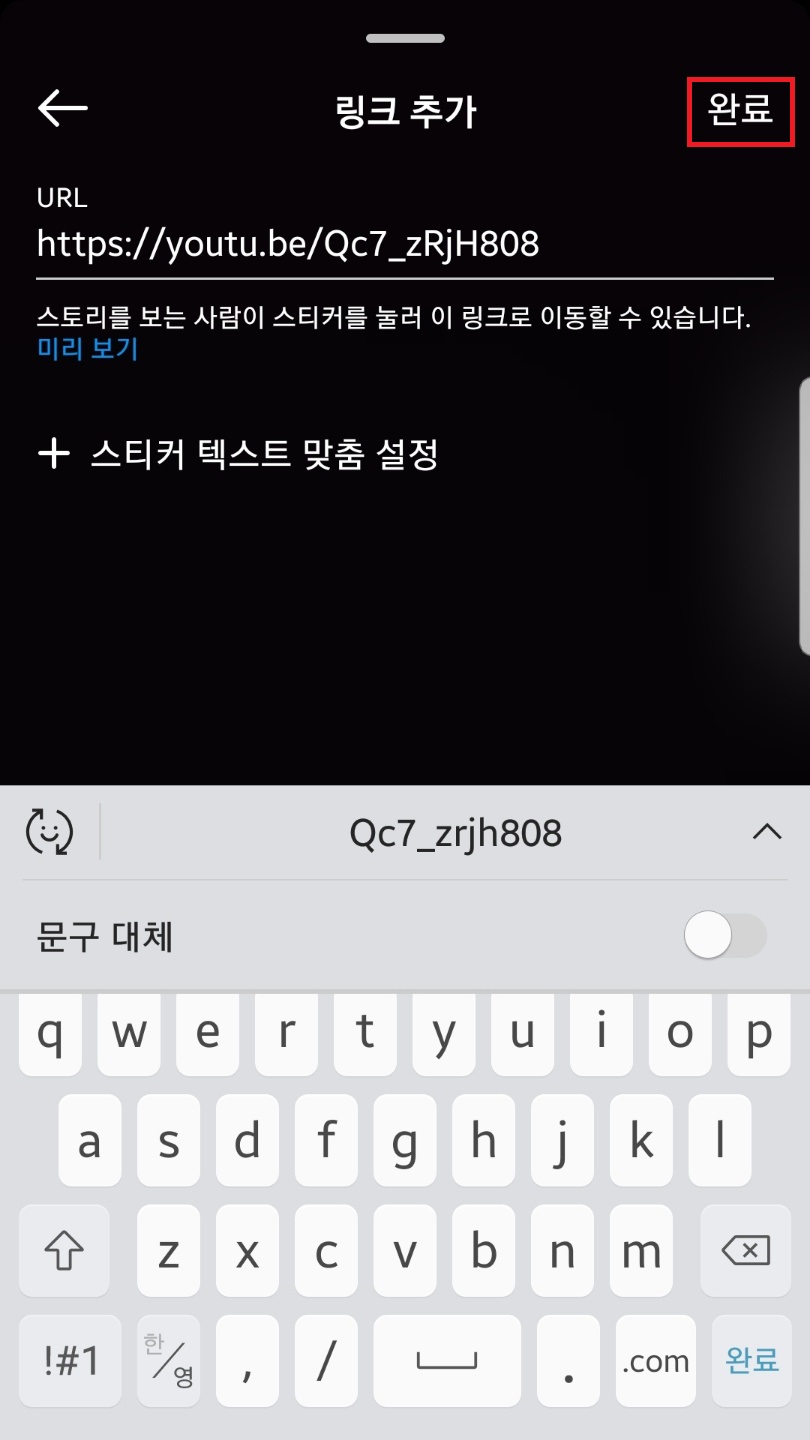 스티커 텍스트 맞춤 설정에 들어가서 원하는 텍스트를 입력한 후 완료를 누르면 YOUTU.BE로 표시되는 대신 입력한 텍스트로 표시 된답니다~!
