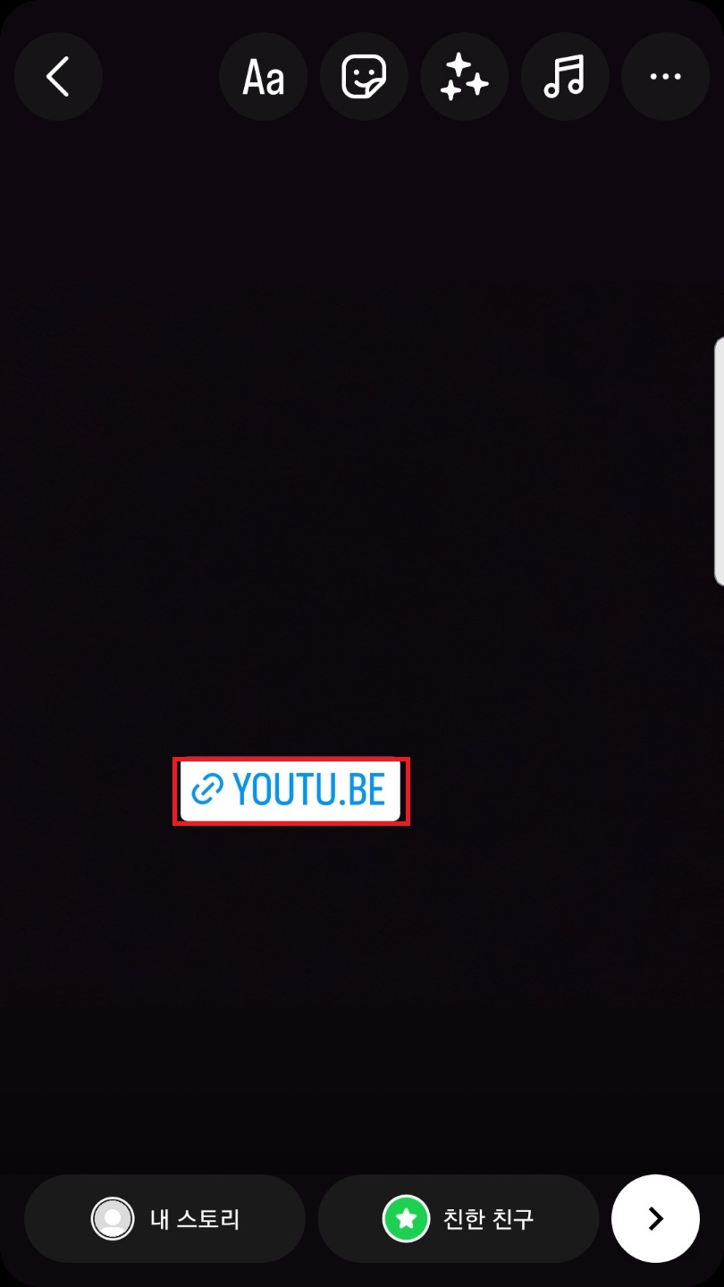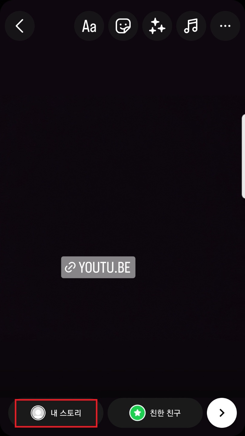 여기까지 잘 따라오셨다면 유튜브 링크 아이콘이 생기는데요. 이걸 드래그하여 원하는 위치를 조정해주시고, 클릭하면 스타일이 바뀌기 때문에 원하는 스타일로 바꾸어주신 후 하단 내 스토리를 클릭해주세요.