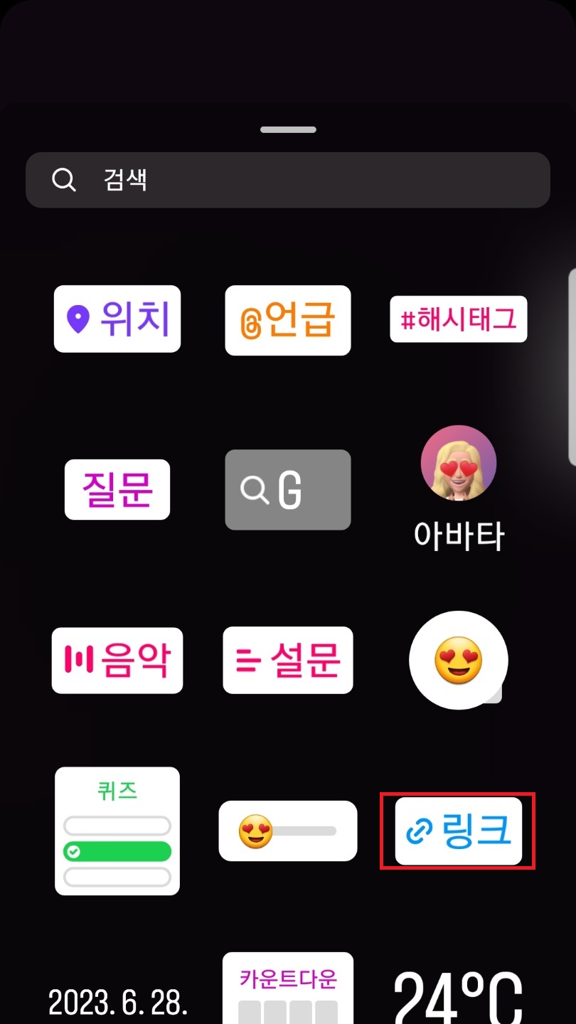스토리에 올릴 사진을 선택해주시고 상단 이모지 아이콘을 눌러주신 후 링크에 들어가주세요.