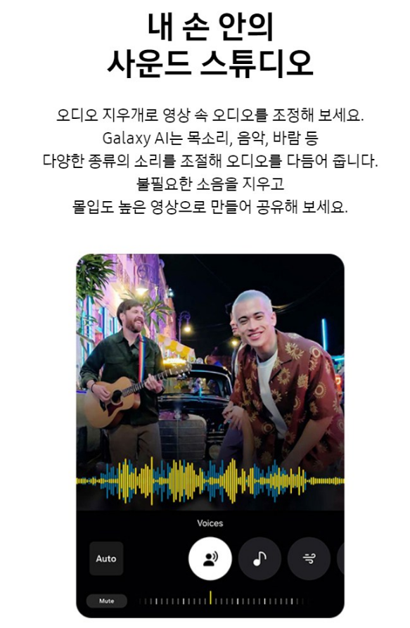 오디오 지우개로 영상 속 오디오를 조정할 수 있어요. 갤럭시 AI는 목소리, 음악, 바람 등 다양한 종류의 소리를 조절해 오디오를 다듬어줘요. 불필요한 소음을 지우고 몰입도 높은 영상으로 만들어 공유할 수 있어요.