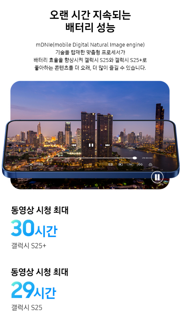mDNle 기술을 탑재한 맞춤형 프로세서가 배터리 효율을 향상시켜 갤럭시25로 좋아하는 콘텐츠를 더 오래, 더 많이 즐길 수 있어요.