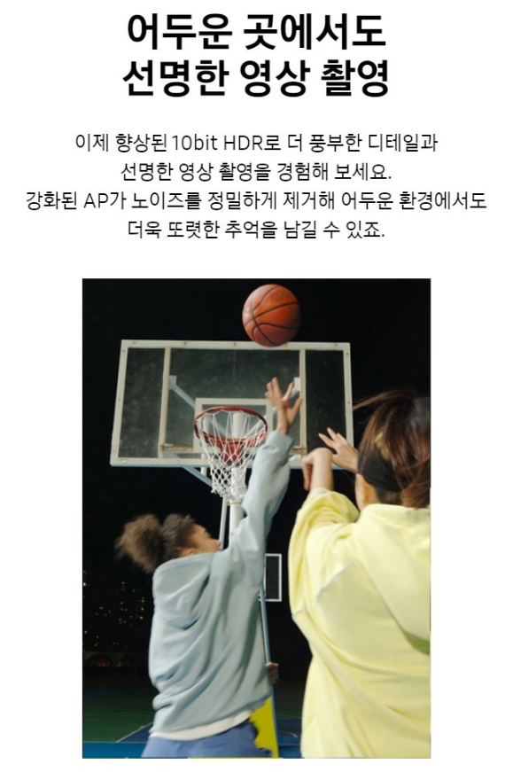 향상된 10bit HDR로 더 풍부한 디테일과 선명한 영상 촬영을 경험할 수 있어요. 강화된 AP가 노이즈를 정밀하게 제거해 어두운 환경에서도 더욱 또렷한 추억을 남길 수 있어요.