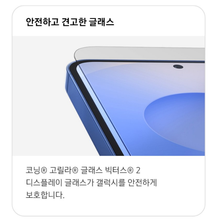 코닝 고릴라 글래스 빅터스 2 디스플레이 글래스가 갤럭시를 안전하게 보호해요.