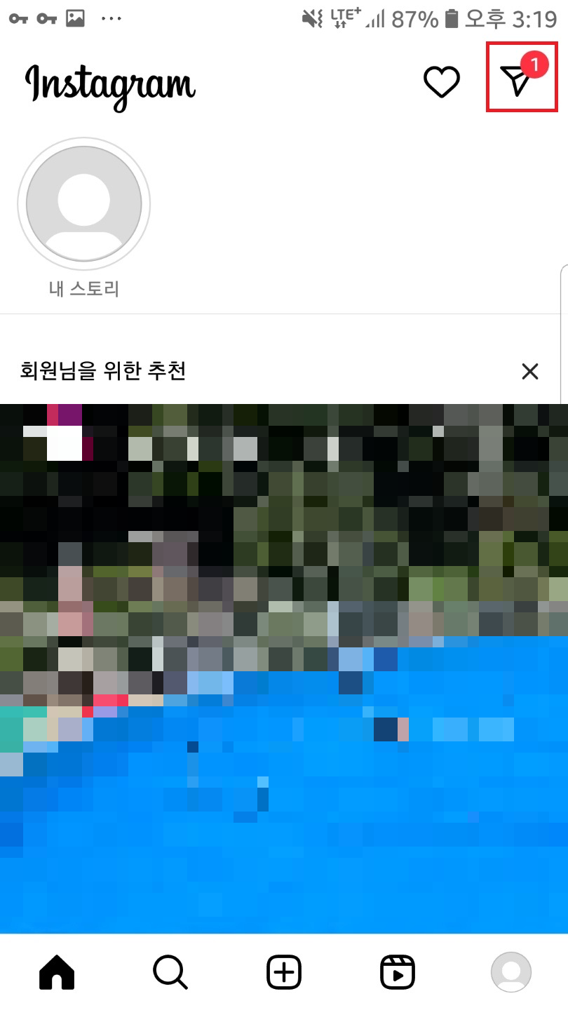 인스타를 실행해주시고 우측 상단 종이비행기 아이콘을 클릭해 디엠창을 열어주세요.