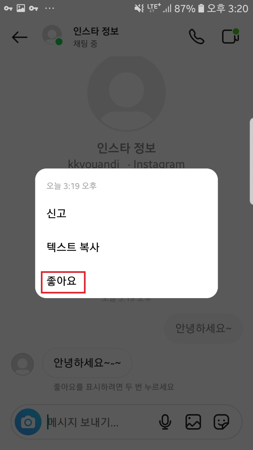 다른 방법으로는 해당 메세지를 꾹 누르시면 몇 개의 선택창이 뜨는데요. 여기서 좋아요를 선택해주시면 똑같이 메세지 밑에 하트가 뜬답니다~