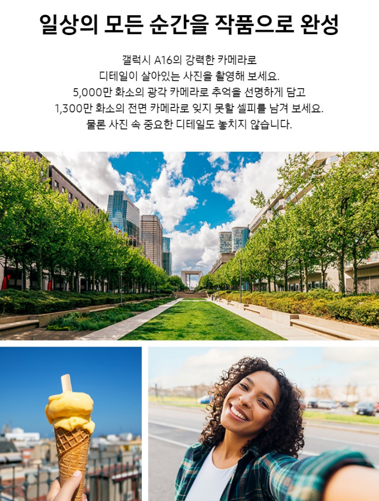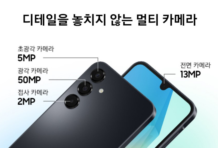 갤럭시 A16은 대화면 디스플레이, 광각 카메라, 대용량 배터리가 가장 큰 강점 3가지예요.