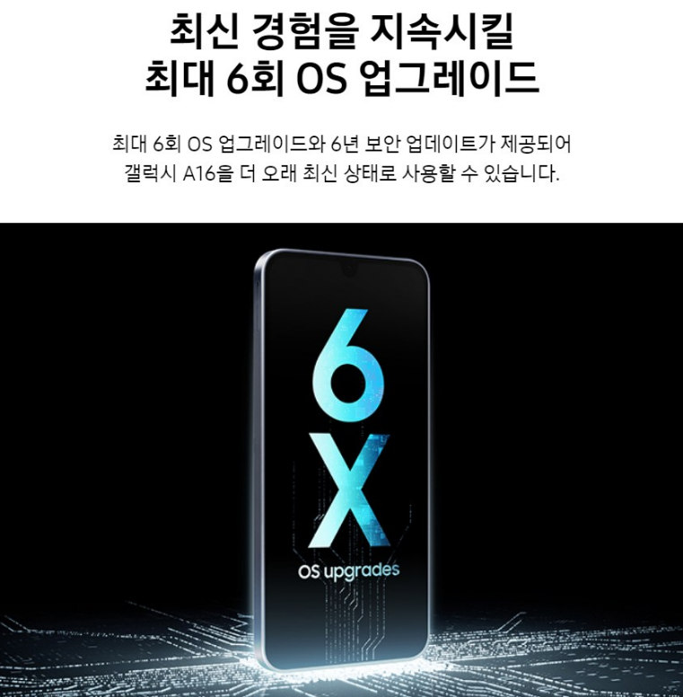 최대 6회 OS 업그레이드와 6년 보안 업데이트가 제공되어 갤럭시 A16을 더 오래 최신 상태로 사용할 수 있어요.