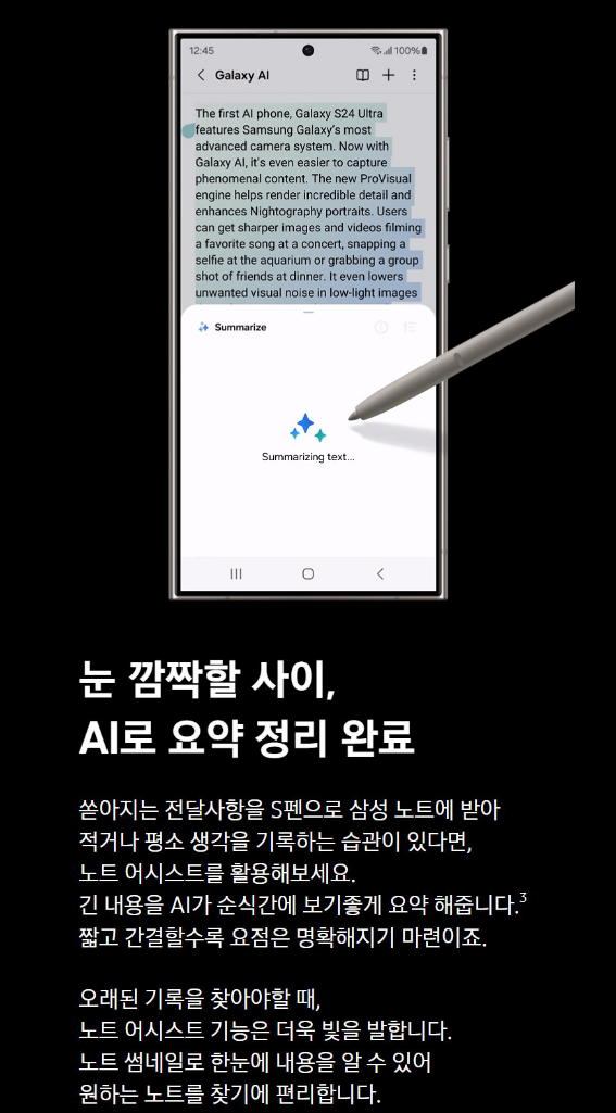 쏟아지는 전달사항을 S펜으로 삼상 노트에 받아 적거나 평소 생각을 기록하는 습관이 있다면 노트 어시스트를 사용해보세요. 긴 내용을 AI가 순식간에 보기 좋게 요약해줘요.