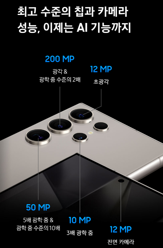 200MP 광각 & 광학 줌 수준의 2배, 12MP 초광각, 50MP 5배 광학 줌 & 광학 줌 수준의 10배 카메라가 탑재되어 있어요.