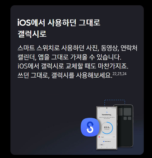 스마트 스위치로 사용하던 사진, 동영상, 연락처, 캘린더, 앱을 그대로 가져올 수 있어요. iOS에서 갤럭시로 교체할 때도 쓰던 그대로 갤럭시를 사용할 수 있어요.