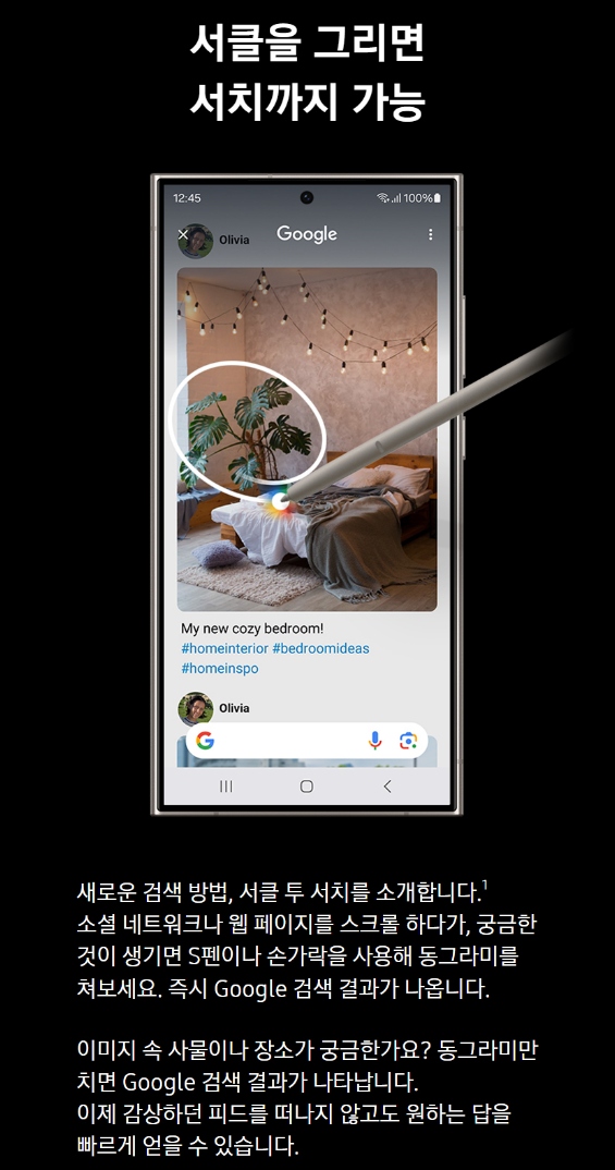 울트러 S24 모델은 새로운 검색 방법인 서클 투 서치 기능이 생겼어요. 소셜 네트워크나 웹 페이지를 스크롤 하다가, 궁금한 것이 생기면 S펜이나 손가락을 사용해 동그라미를 쳐보세요. 즉시 구글 검색 결과가 나와요.