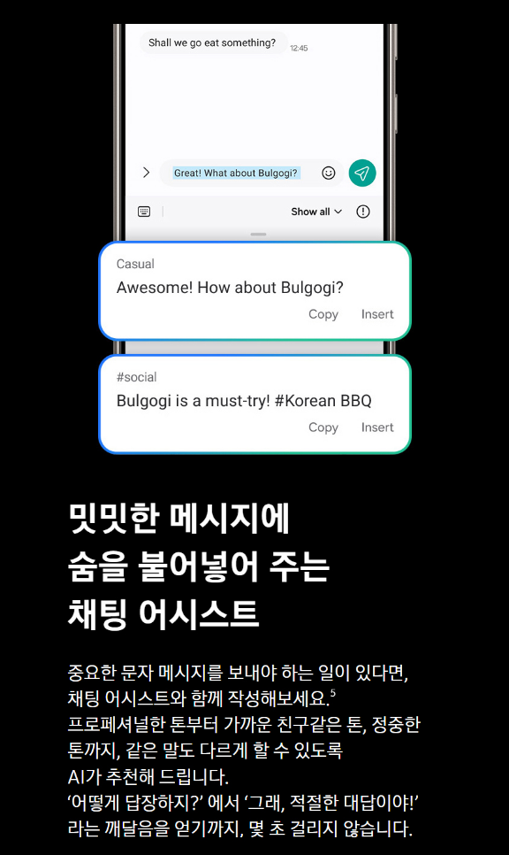 중요한 문자 메세지를 보내야 하는 일이 있다면, 채팅 어시스트와 함께 작성해보세요. 프로페셔널한 톤부터 가까운 친구같은 톤, 정중한 톤까지 같은 말도 다르게 할 수 있도록 AI가 추천해줘요.
