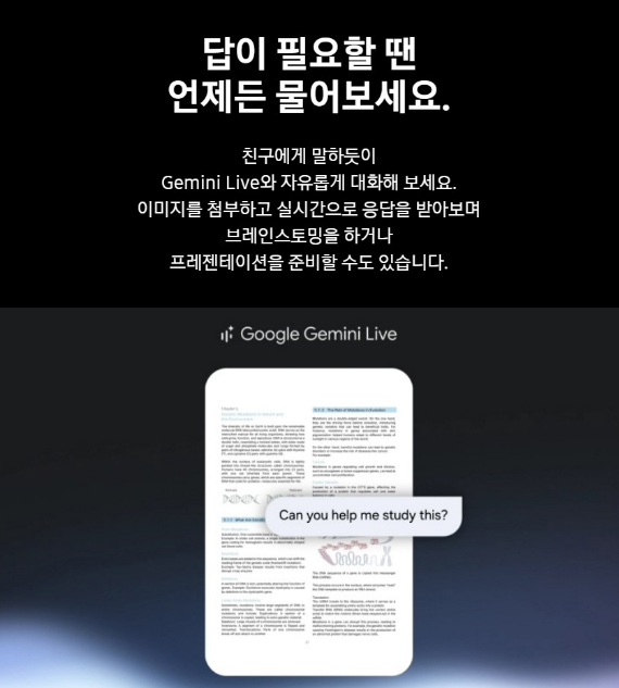 친구와 말하듯이 Gemini Live와 자유롭게 대화해 보세요. 이미지를 첨부하고 실시간으로 응답을 받아보며 브레인스토밍 하거나 프레젠테이션을 준비할 수도 있어요.