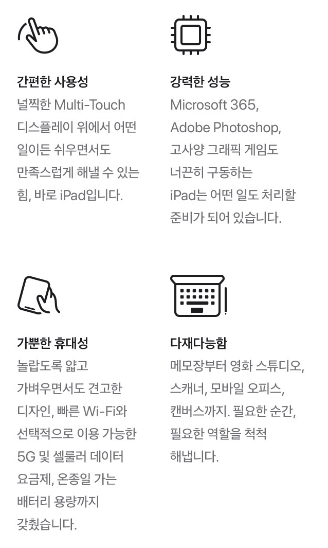 특히 스플릿 뷰와 슬라이드 오버 기능을 통해 두 개의 앱을 동시에 실행하거나 빠르게 앱 전환하는 것이 가능해 업무나 학습용으로 구매하는 사용자에게 유용하며 시간 관리에도 큰 도움을 줘요.