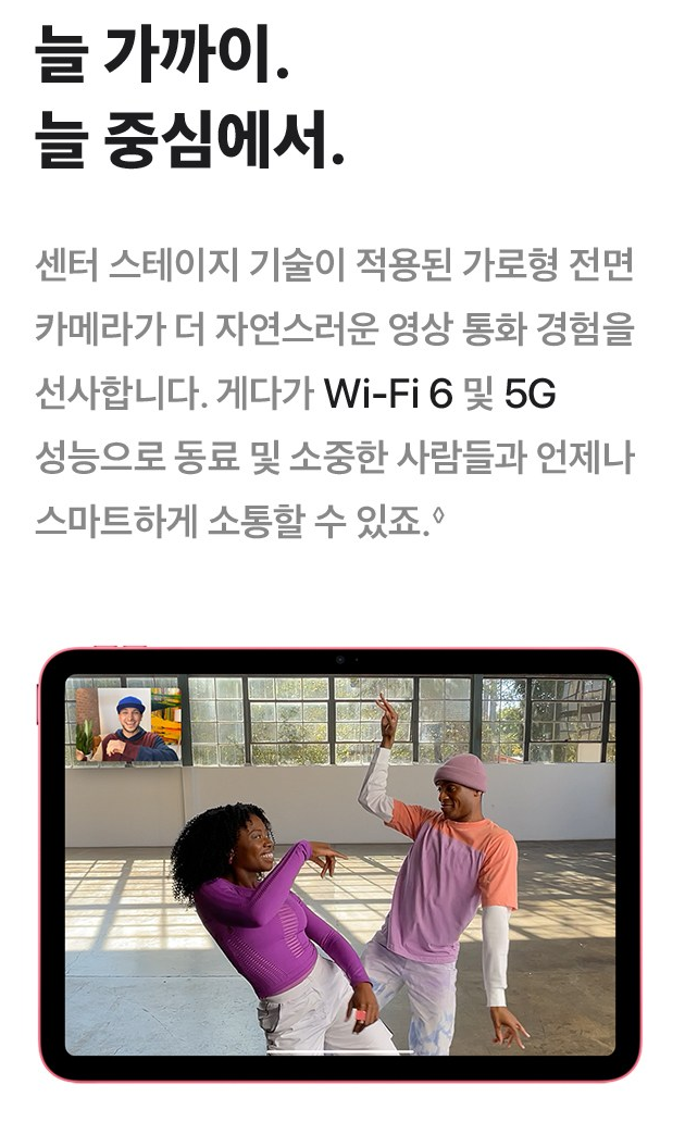 센터 스테이지 기술이 적용된 가로형 전면 카메라가 더 자연스러운 영상 통화 경험을 선사해요. 게다가 와이파이 6및 5G 성능으로 동료 및 소중한 사람들과 언제나 스마트하게 소통할 수 있어요.