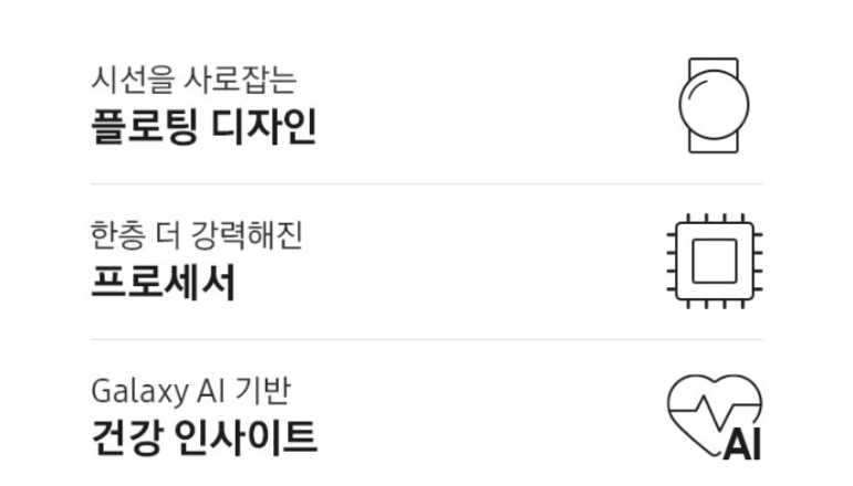 갤럭시워치 7은 플로팅 디자인, 한층 더 강력해진 프로세서, 갤럭시 AI 기반 건강 인사이트가 가장 큰 3가지 특징이에요.