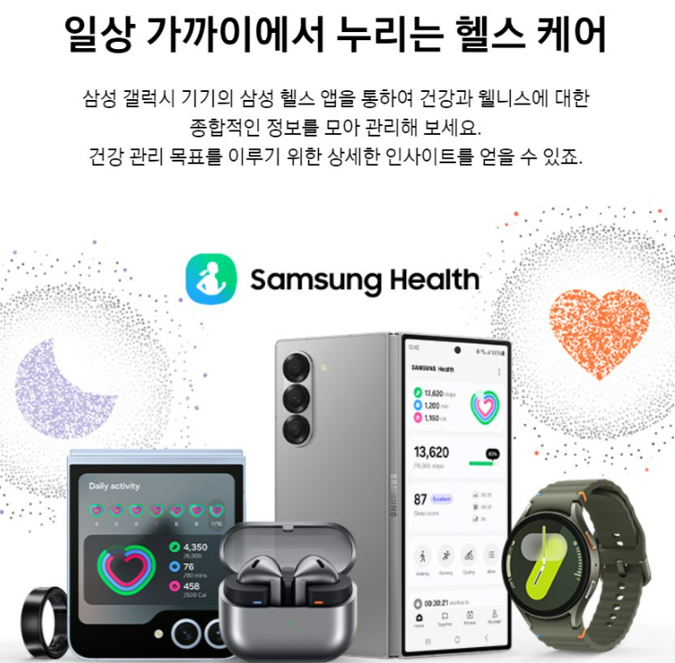 삼성 갤럭시 기기의 삼성 헬스 앱을 통하여 건강과 웰니스에 대한 종합적인 정보를 모아 관리해보세요. 건강 관리 목표를 이루기 위한 상세한 인사이트를 얻을 수 있어요.