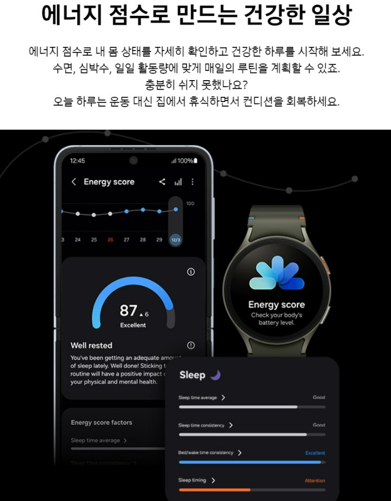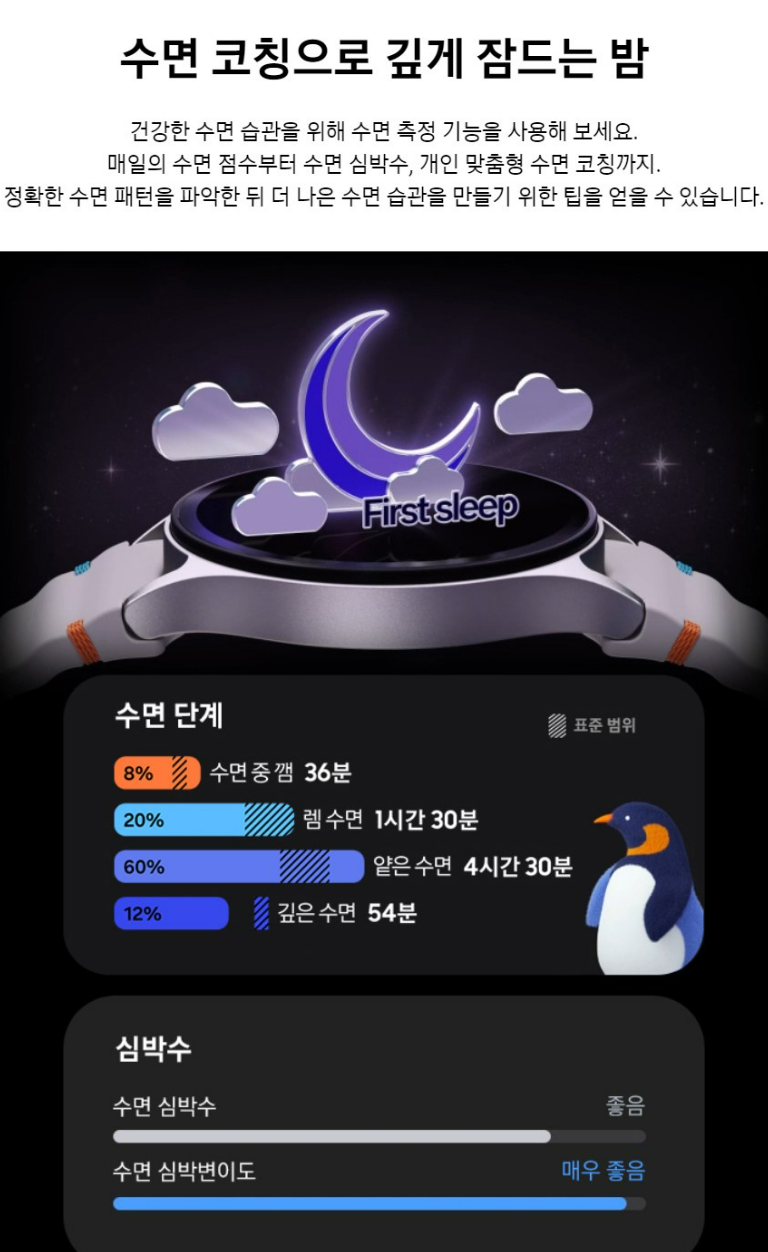 건강한 수면 습관을 위해 수면 측정 기능을 사용해 보세요. 매일의 수면 점수부터 수면 심박수, 개인 맞춤형 수면 코칭까지 정확한 수면 패턴을 파악한 뒤 더 나은 수면 습관을 만들기 위한 팁을 얻을 수 있어요.
