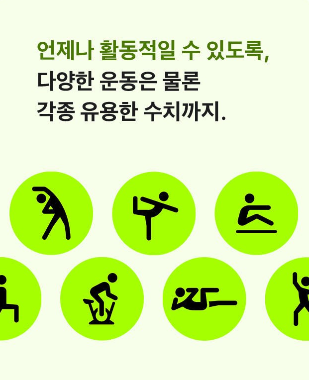 언제나 활동적일 수 있도록 다양한 운동은 물론 각종 유용한 수치까지 확인해볼 수 있어요.