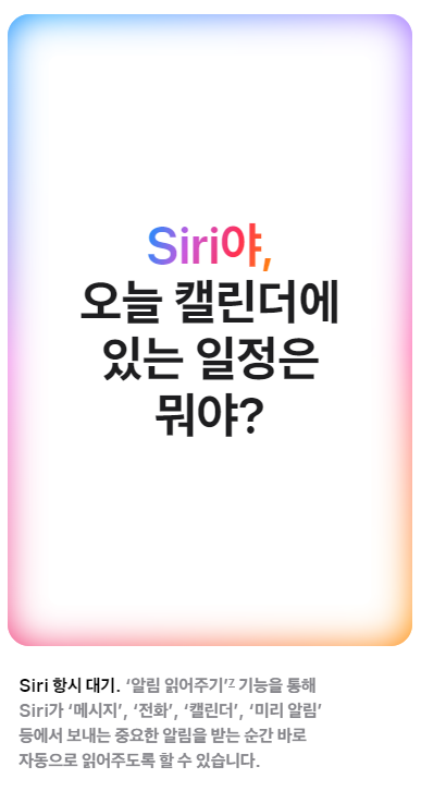 ‘알림 읽어주기’ 기능을 통해 Siri가 ‘메시지’, ‘전화’, ‘캘린더’, ‘미리 알림’ 등에서 보내는 중요한 알림을 받는 순간 바로 자동으로 읽어주도록 할 수 있어요.