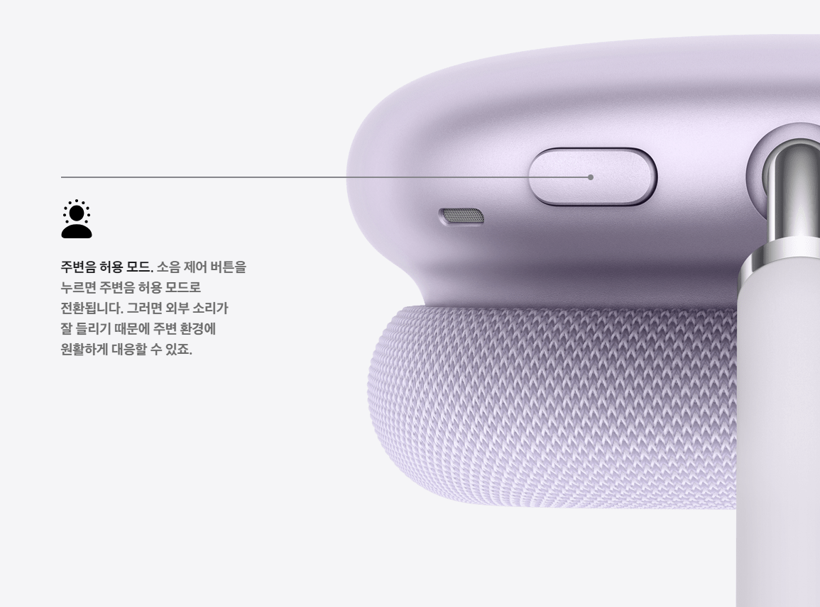 소음 제어 버튼을 누르면 주변음 허용 모드로 전환돼요. 그러면 외부 소리가 잘 들리기 때문에 주변 환경에 원활하게 대응할 수 있어요.