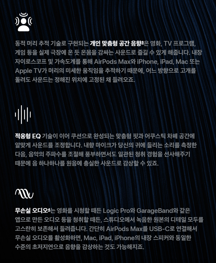 동적 머리 추적 기술로 구현되는 개인 맞춤형 공간 음향은 영화, TV 프로그램, 게임 등을 실제 극장에 온 듯 온몸을 감싸는 사운드로 즐길 수 있게 해줘요. 적응형 EQ 기술이 이어 쿠션으로 완성되는 맞춤형 핏과 어쿠스틱 차폐 공간에 알맞게 사운드를 조정해요. 또한 무손실오디오는 영화를 시청할 때든 Logic Pro와 GarageBand와 같은 앱으로 만든 오디오 등을 청취할 때든, 스튜디오에서 녹음한 원본의 디테일 모두를 고스란히 보존해서 들려줘요.
