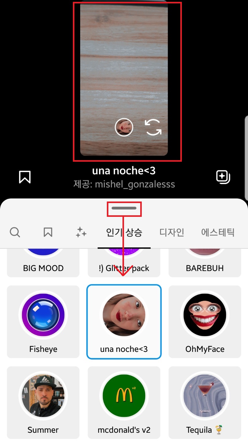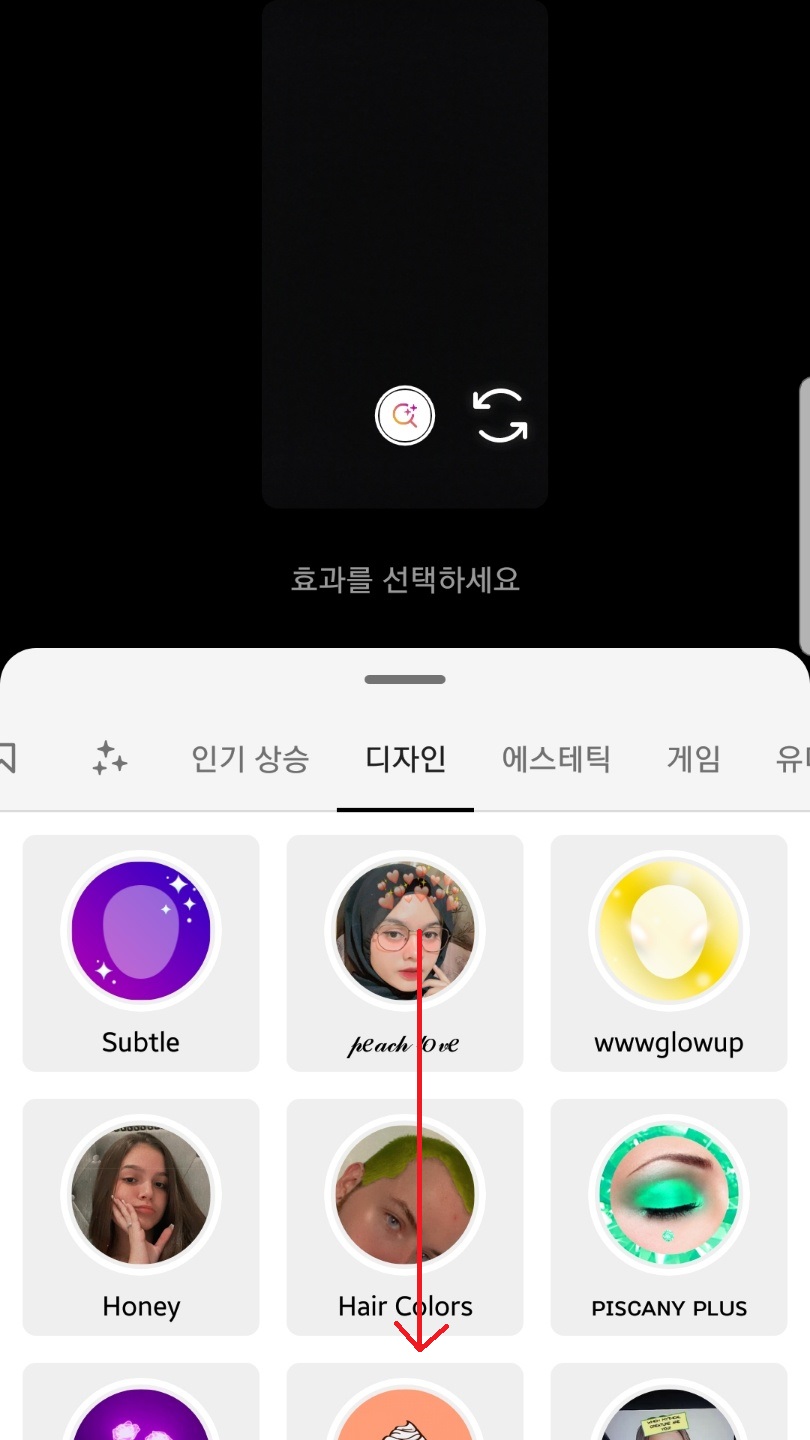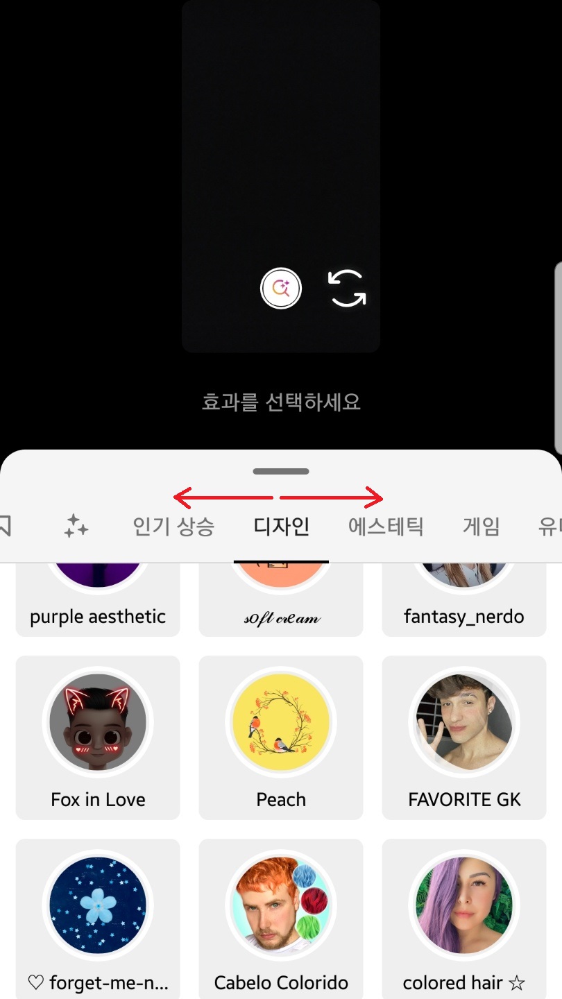 아래에서 나타난 화면을 양옆으로 밀어 디자인, 인기 상승, 에스테틱 등 카테고리를 선택해준 후 아래로 내리면서 필터를 골라주세요.