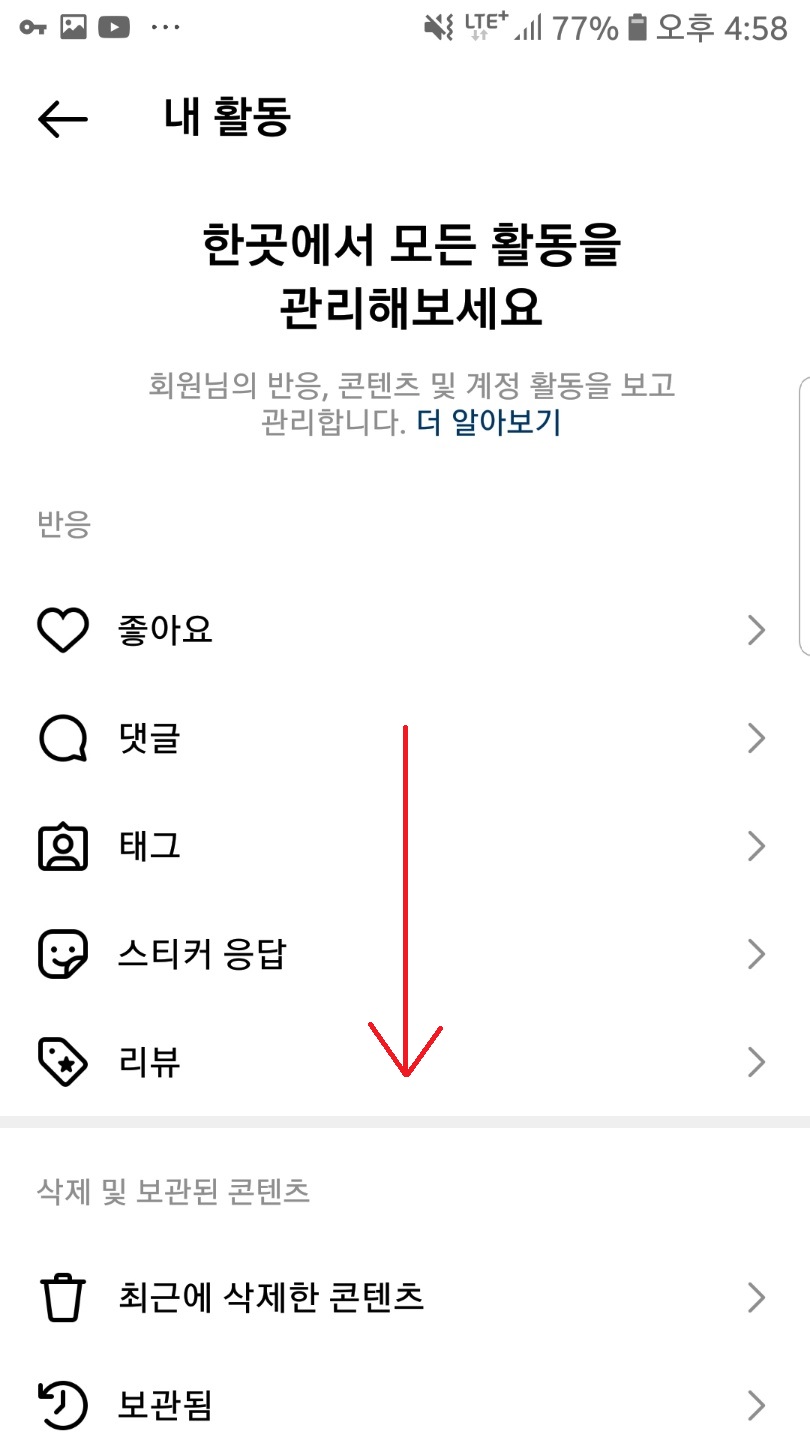 보관탭 밑에 있는 내 활동을 클릭해주세요.