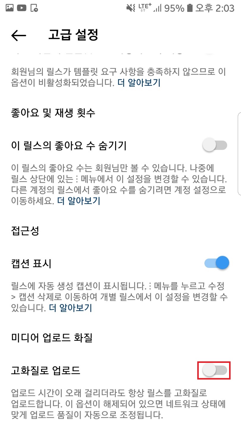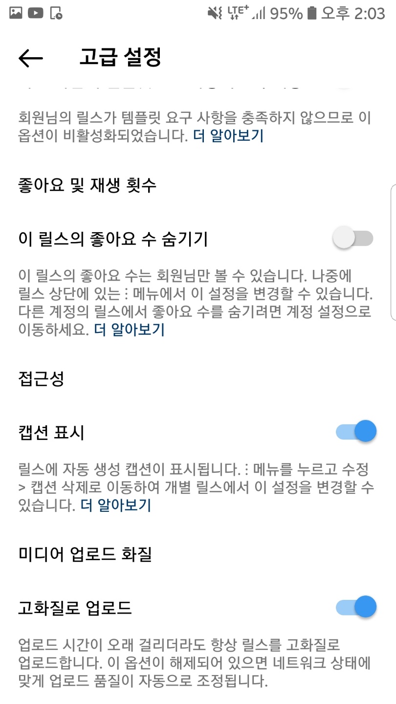 고급 설정에 들어가면 고화질로 업로드 뿐만 아니라 좋아요 수 숨기기나 템플릿 설정등 다양한 설정을 할 수 있으니 참고하세요!
