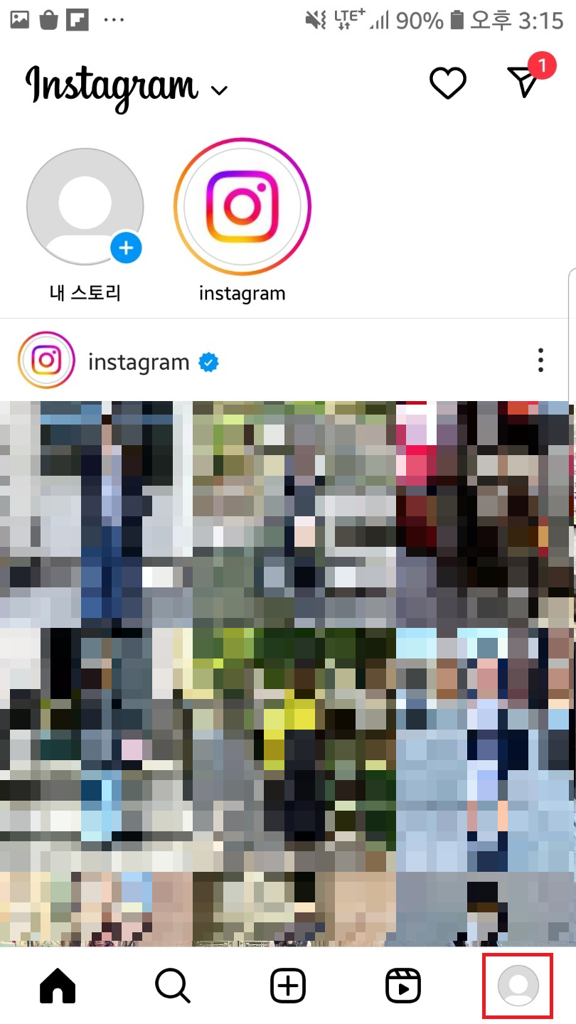 인스타 어플을 실행해주시고 우측 하단 프로필 사진을 클릭하여 내 피드에 들어가주세요.