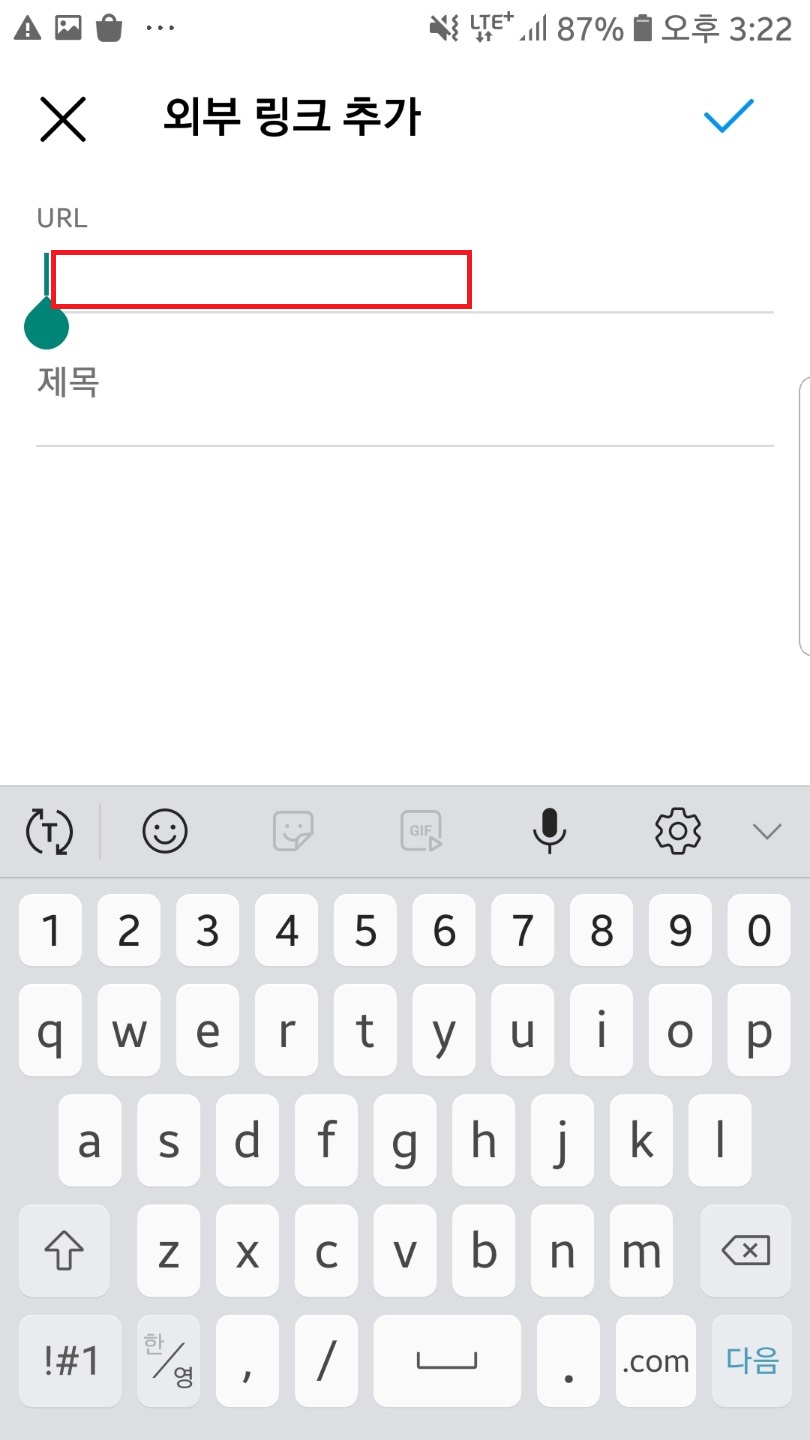 URL칸을 길게 누르면 위에 메뉴가 뜨는데요. 여기서 붙여넣기를 클릭해주신 뒤 체크 표시를 눌러주세요.