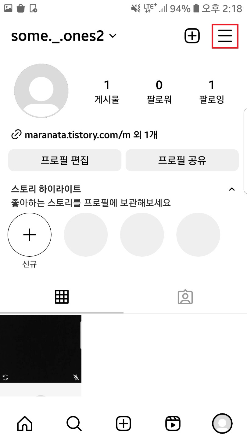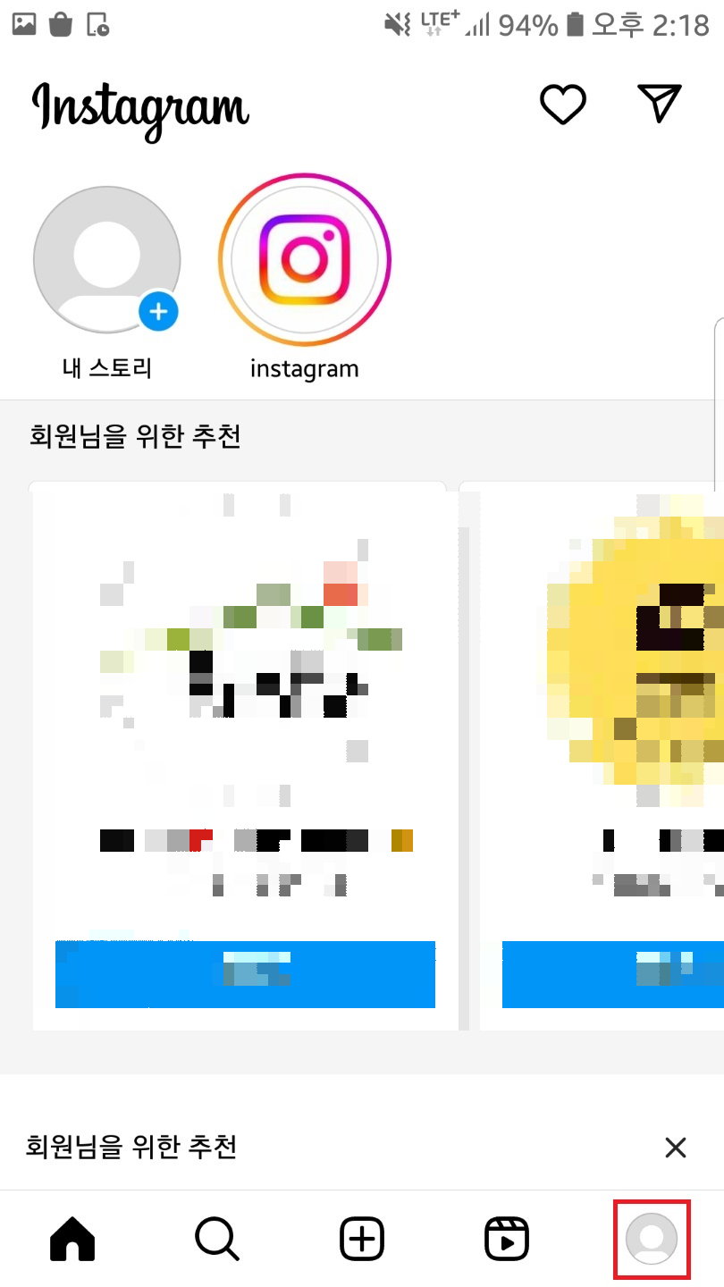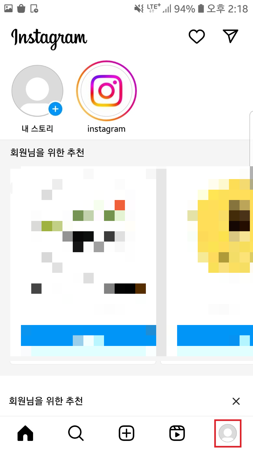 인스타 어플을 실행해주시고 우측 하단 프로필을 클릭하여 내 피드로 들어가주세요.