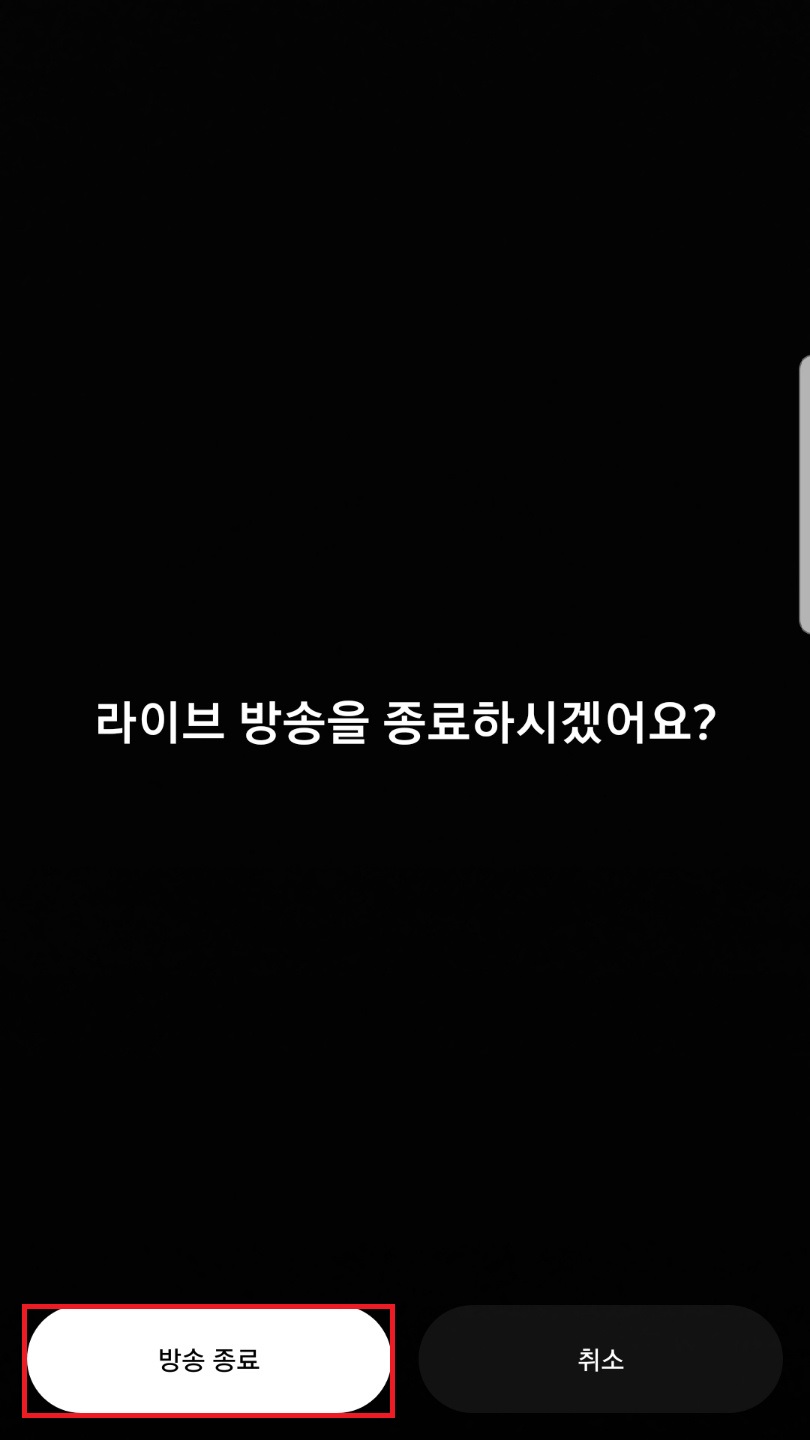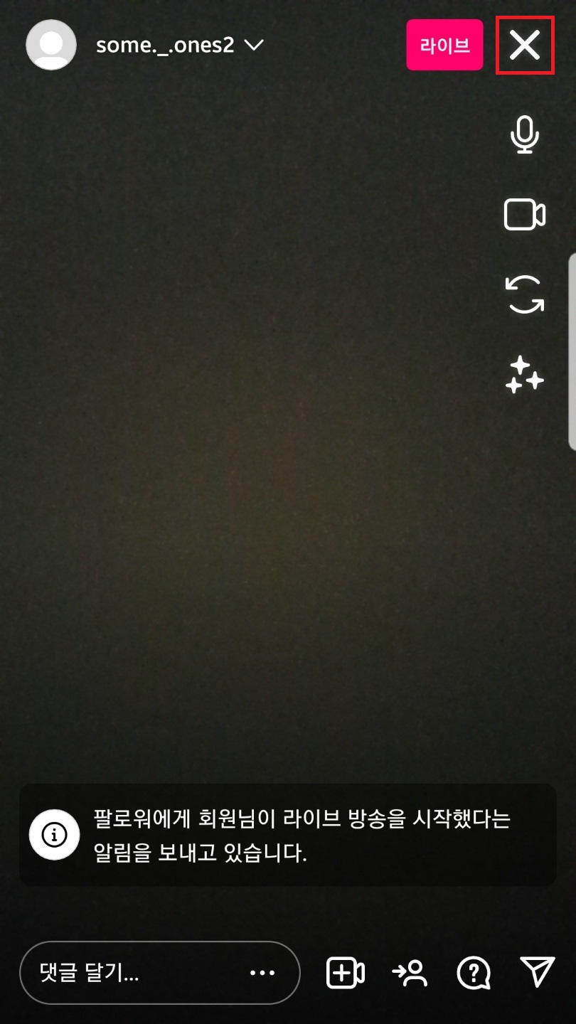 가운데 버튼을 눌러 라이브를 시작하고 진행해주신 후 우측 상단 x를 누른 후 방송 종료를 눌러주세요!
