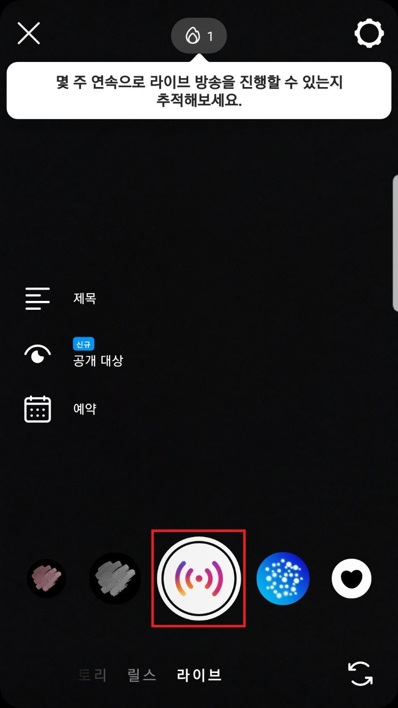 하단 메뉴 중 가운데에 있는 +버튼을 눌러주신 후 라이브에 들어가주세요.