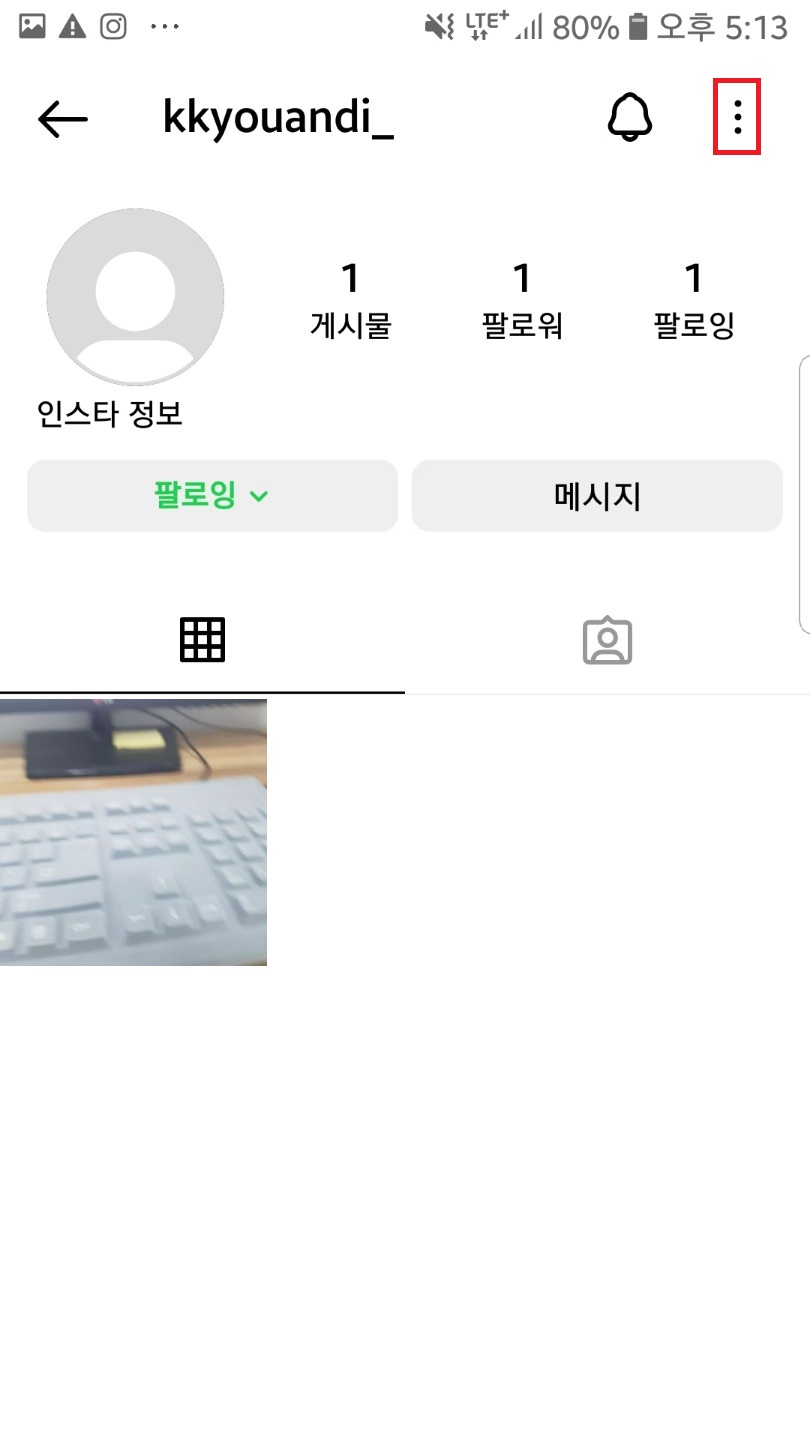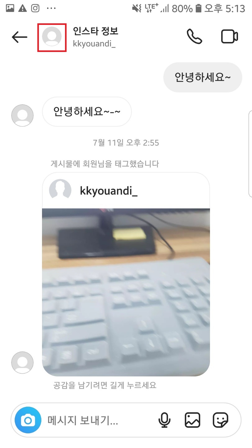 메세지를 선택해주시고 상단에 있는 상대의 프로필을 선택해 상대 피드로 들어가주세요.