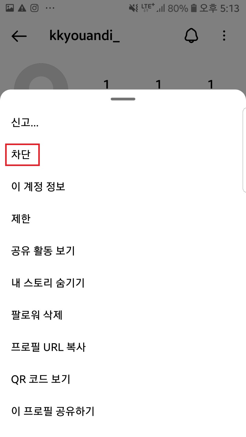 우측 상단 선 세개를 클릭하면 나오는 차단 버튼을 눌러주세요!