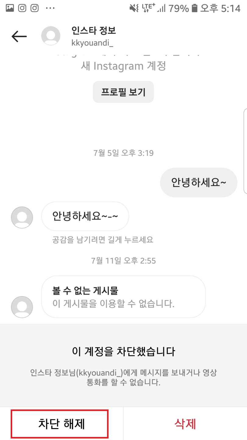 차단을 해제하시려면 그 사람과의 디엠창에 들어가서도, 프로필에 들어가서도 간편하게 가능하니 참고하세요!