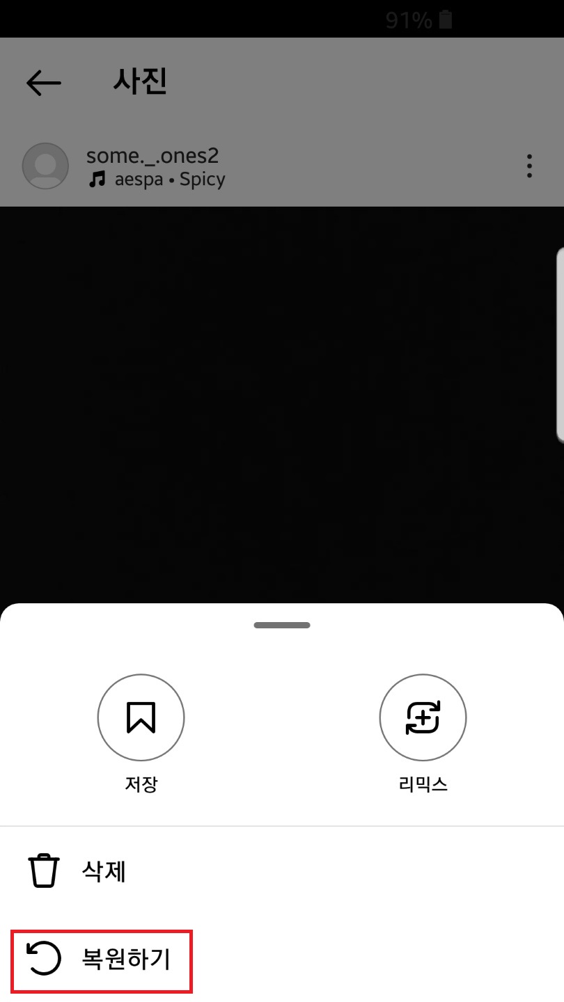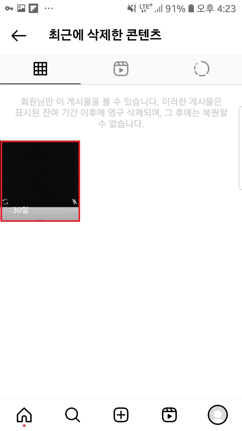 삭제한 콘텐츠는 이곳에서 30일간 보관되는데요. 여기서 삭제된 콘텐츠를 누르고 우측 상단 점 세개를 클릭하여 복원하기를 누르면 다시 피드로 복원할 수 있답니다!