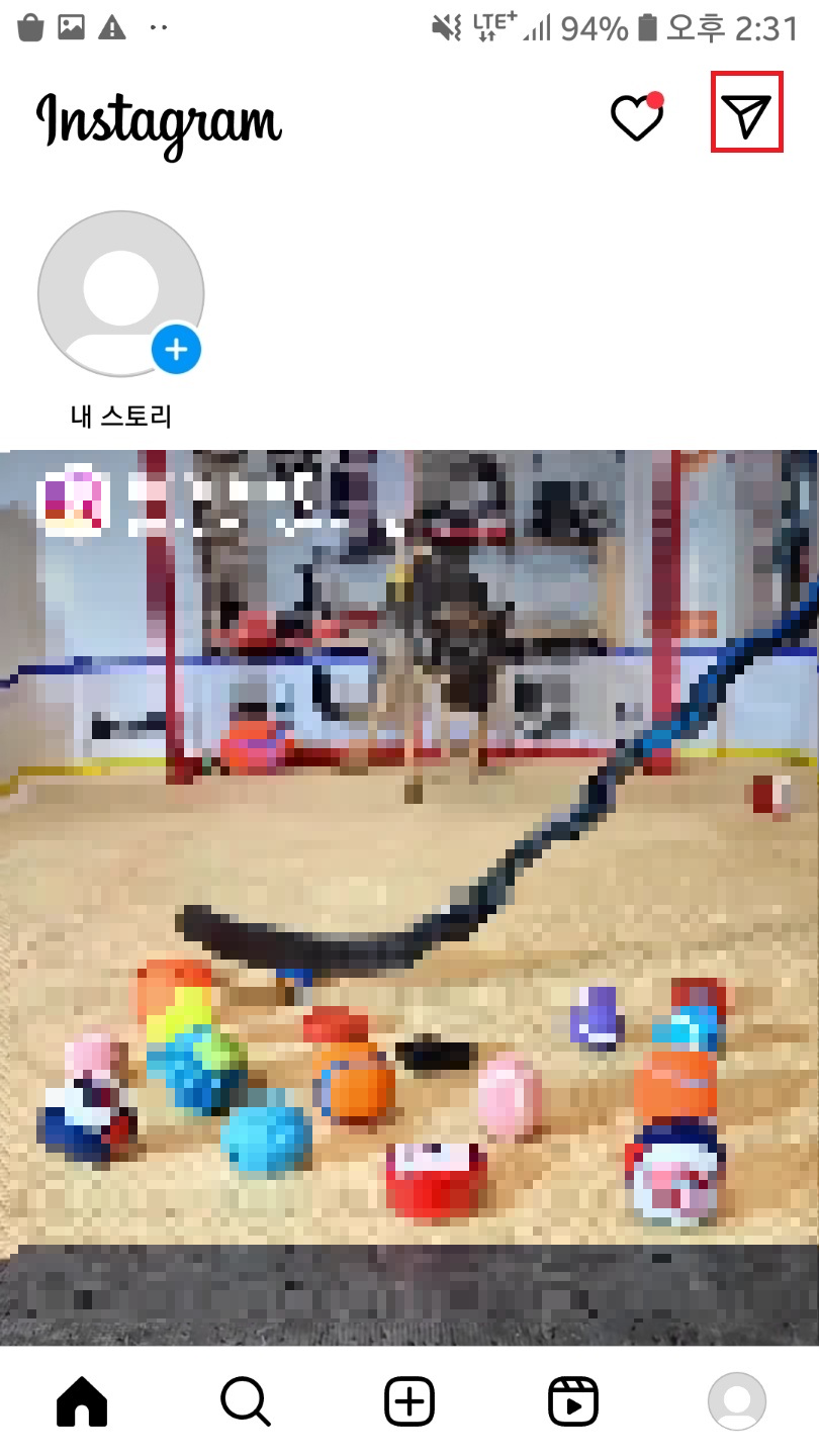인스타 어플을 실행해주시고 우측 상단 종이비행기 아이콘을 클릭해주세요!(업데이트 상황에 따라 말풍선 아이콘일 수 있어요.)
