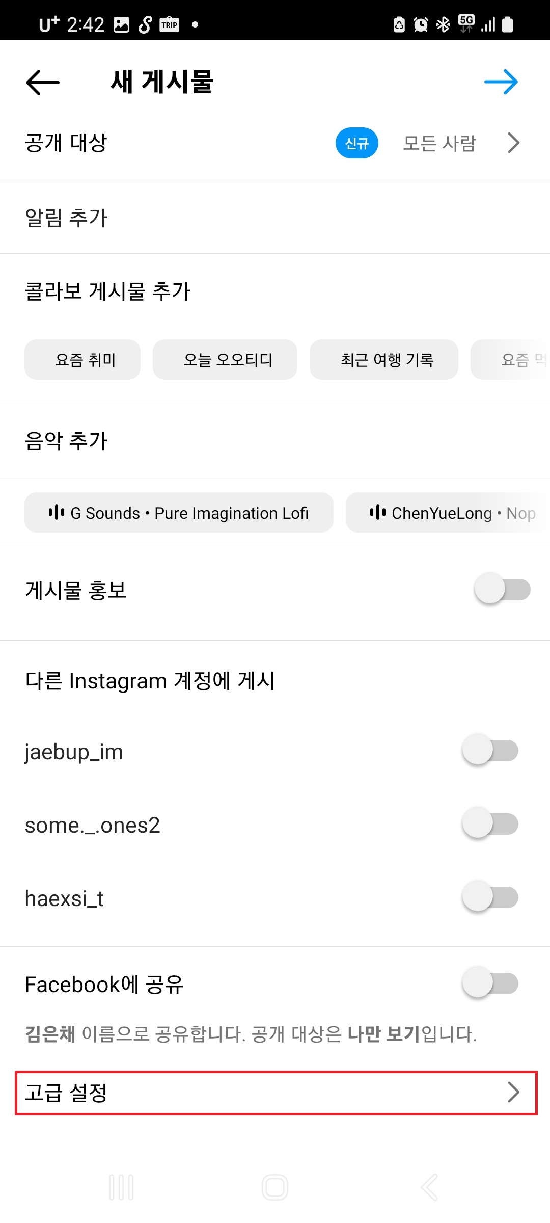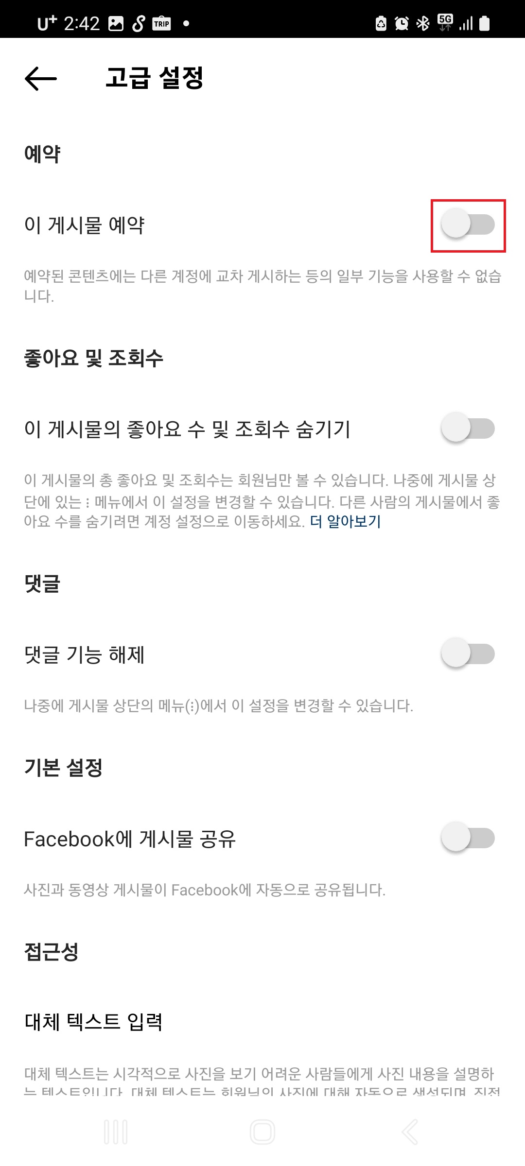 게시물 작성 탭에서 아래로 내려보시면 고급 설정이 있는데요. 이 고급 설정에 들어가서 이 게시물 예약을 클릭해주세요.