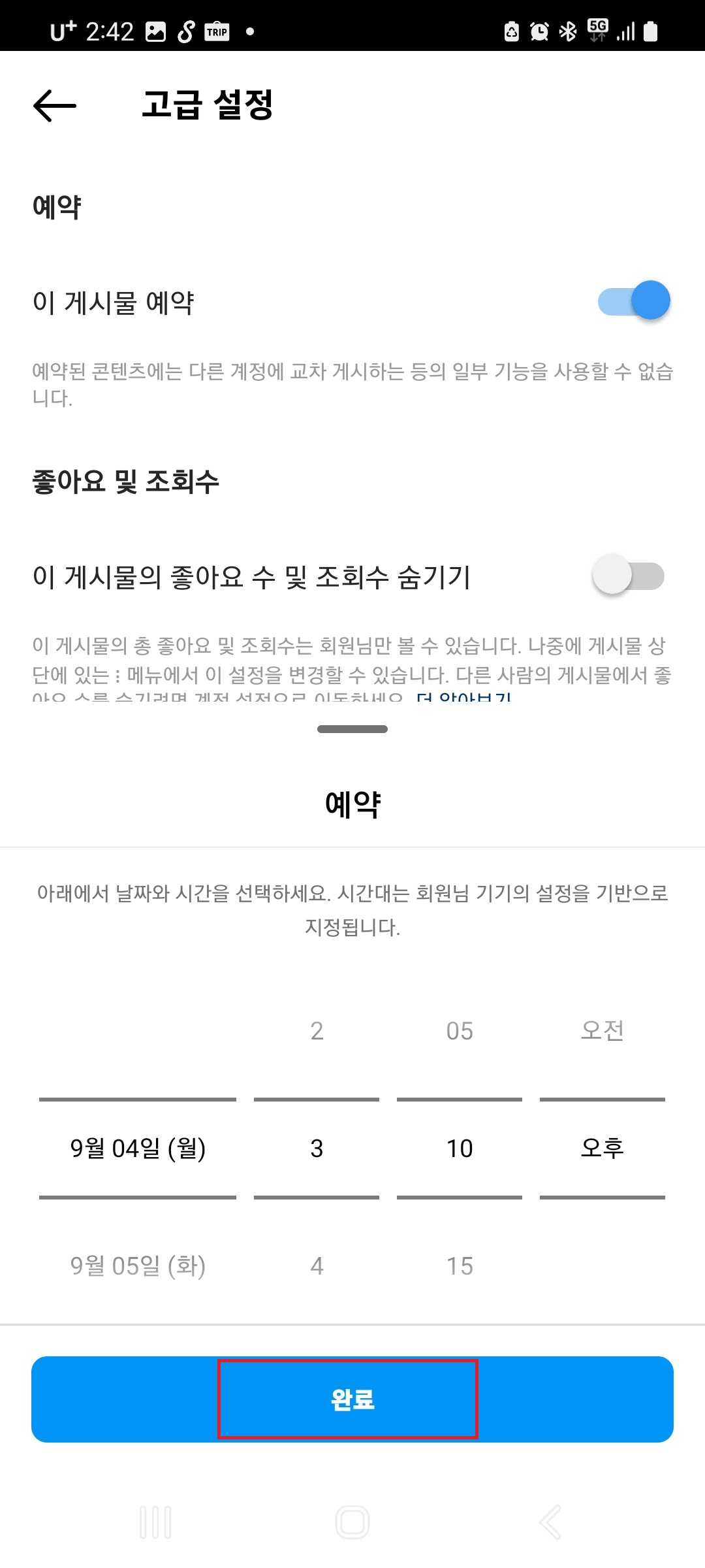 하단에 뜨는 예약 시간을 위아래로 스크롤하여 게시를 원하는 시간을 설정해주시고 밑에 완료를 눌러주세요~
