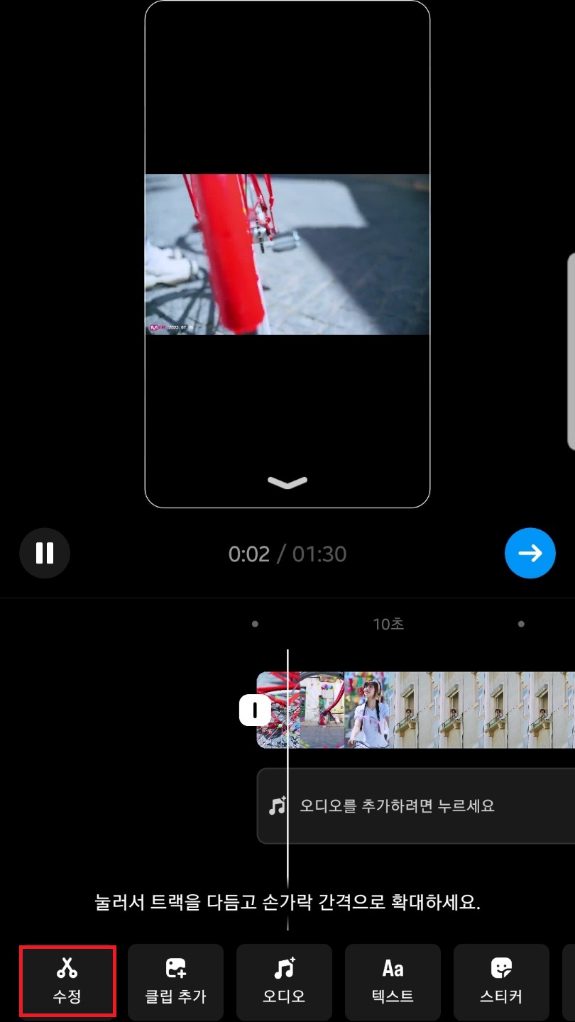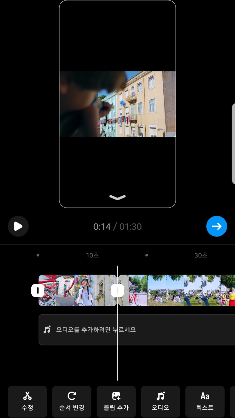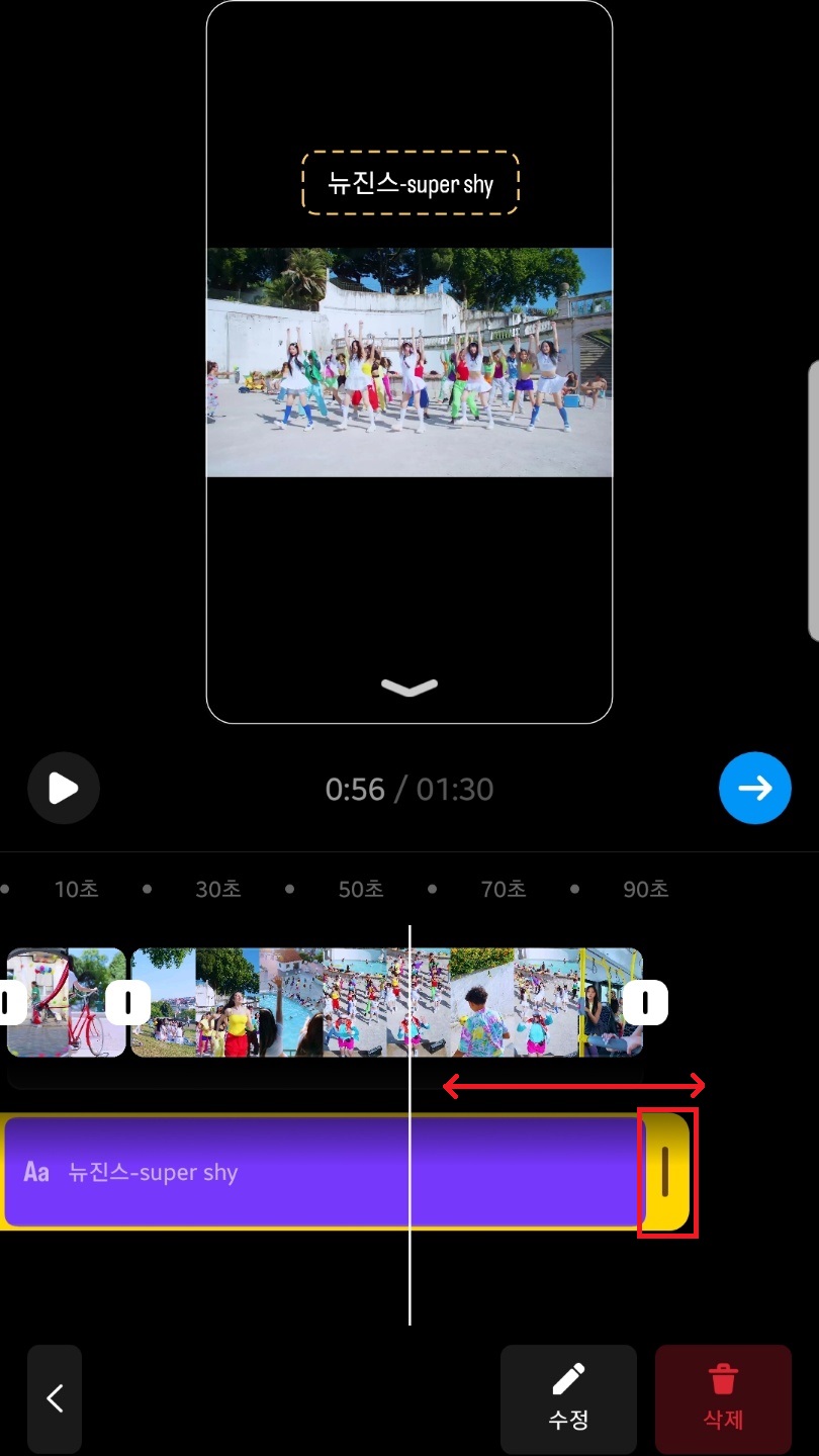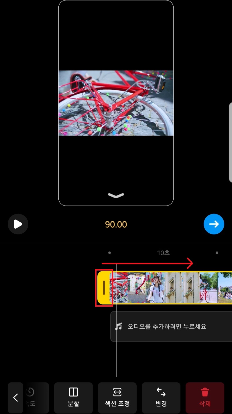 영상 클립이 뜨는데 영상 클립 옆 쪽에 뜨는 노란색 바를 선택해주시고 꾹 누른 채로 옆으로 드래그해서 영상 길이를 조절할 수 있어요. 최대 90초까지 가능하답니다.