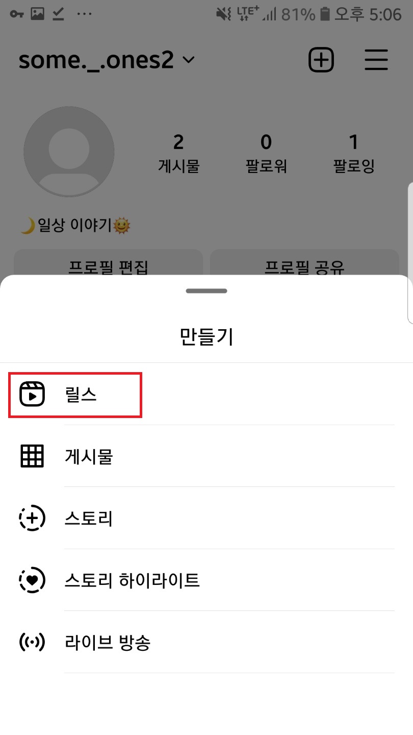 우측 상단 +아이콘을 클릭해주시고 릴스를 선택해주세요.