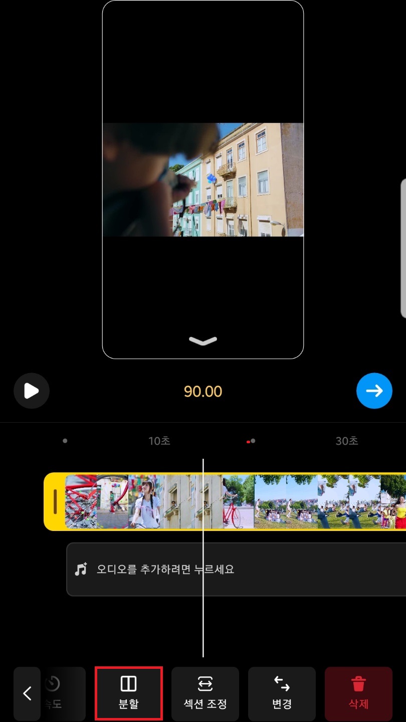 영상 클립에 뜨는 흰색 얇은 선을 자르고 싶은 부분에 놓아준 후 분할을 누르시면 영상이 두개로 분할된답니다.