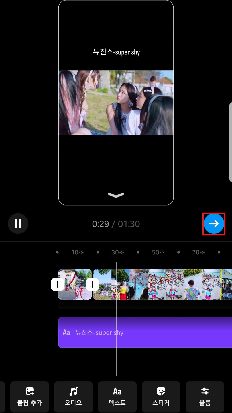 수정이 완료됐다면 영상 미리보기 밑 우측화살표를 클릭해주시고 공유하기를 선택해주세요.