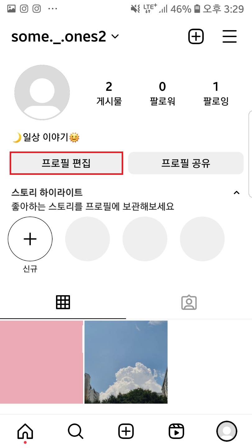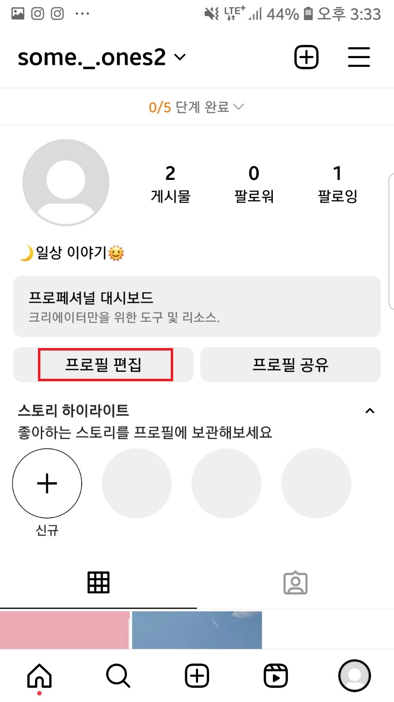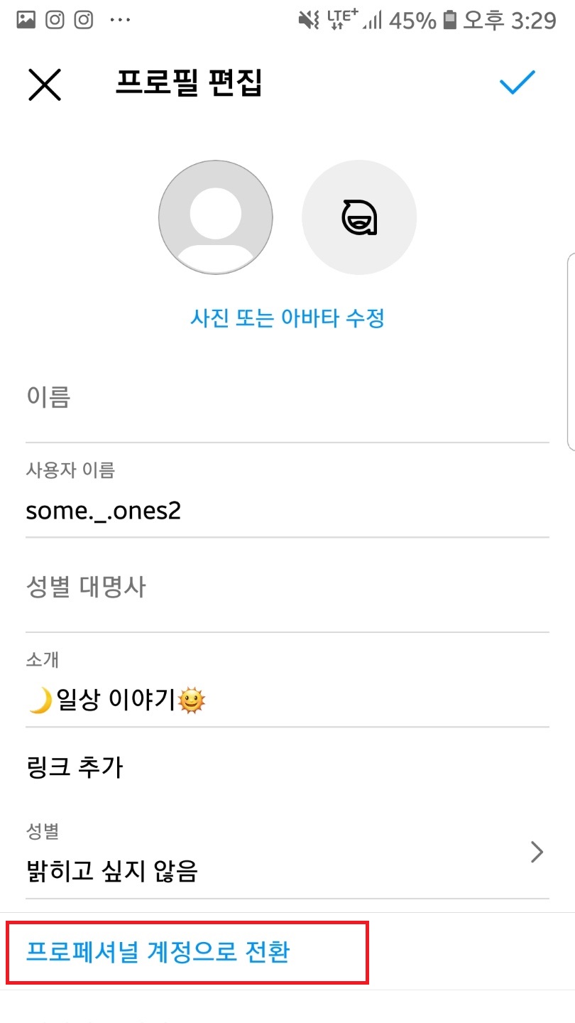 직업추가를 하기 위해선 프로페셔널 계정으로 전환해야하기 때문에 프로필 편집을 누르고 밑에 프로페셔널 계정으로 전환을 클릭해주세요.