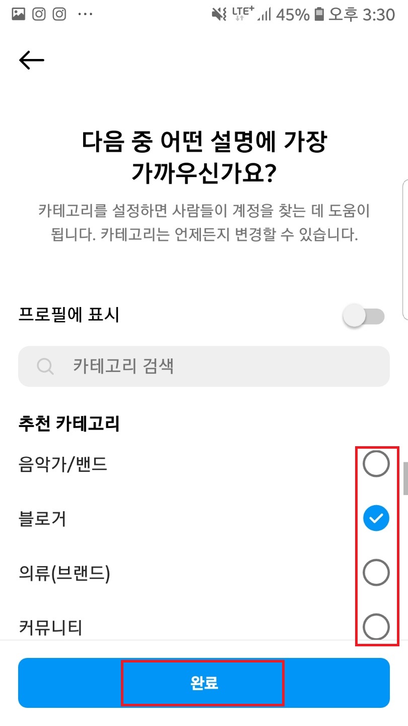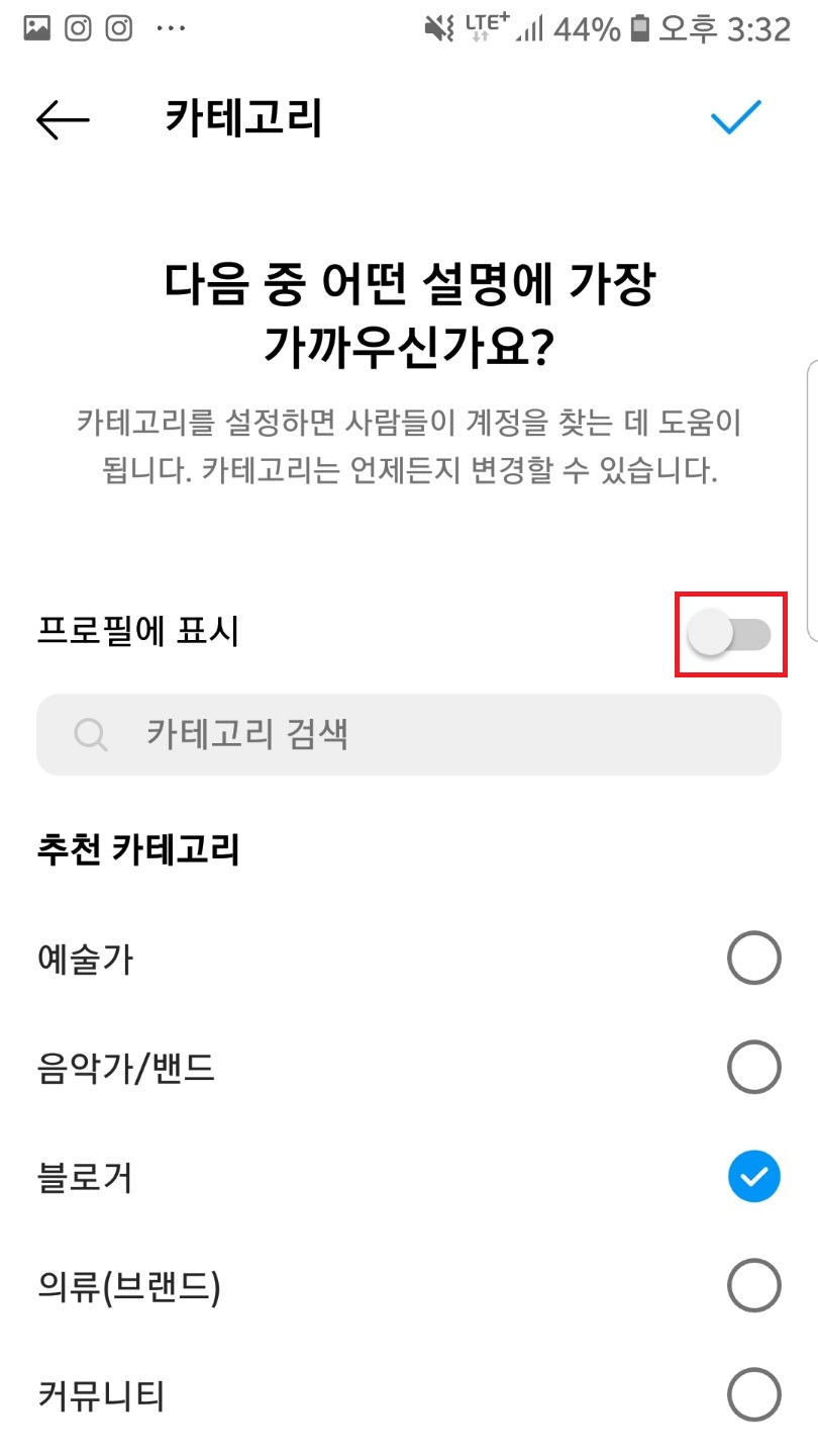 카테고리를 다시 선택해주시고 위에 프로필에 표시가 뜨면 ON으로 바꿔주세요.