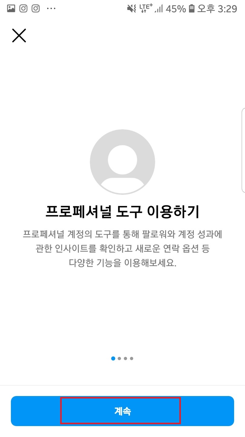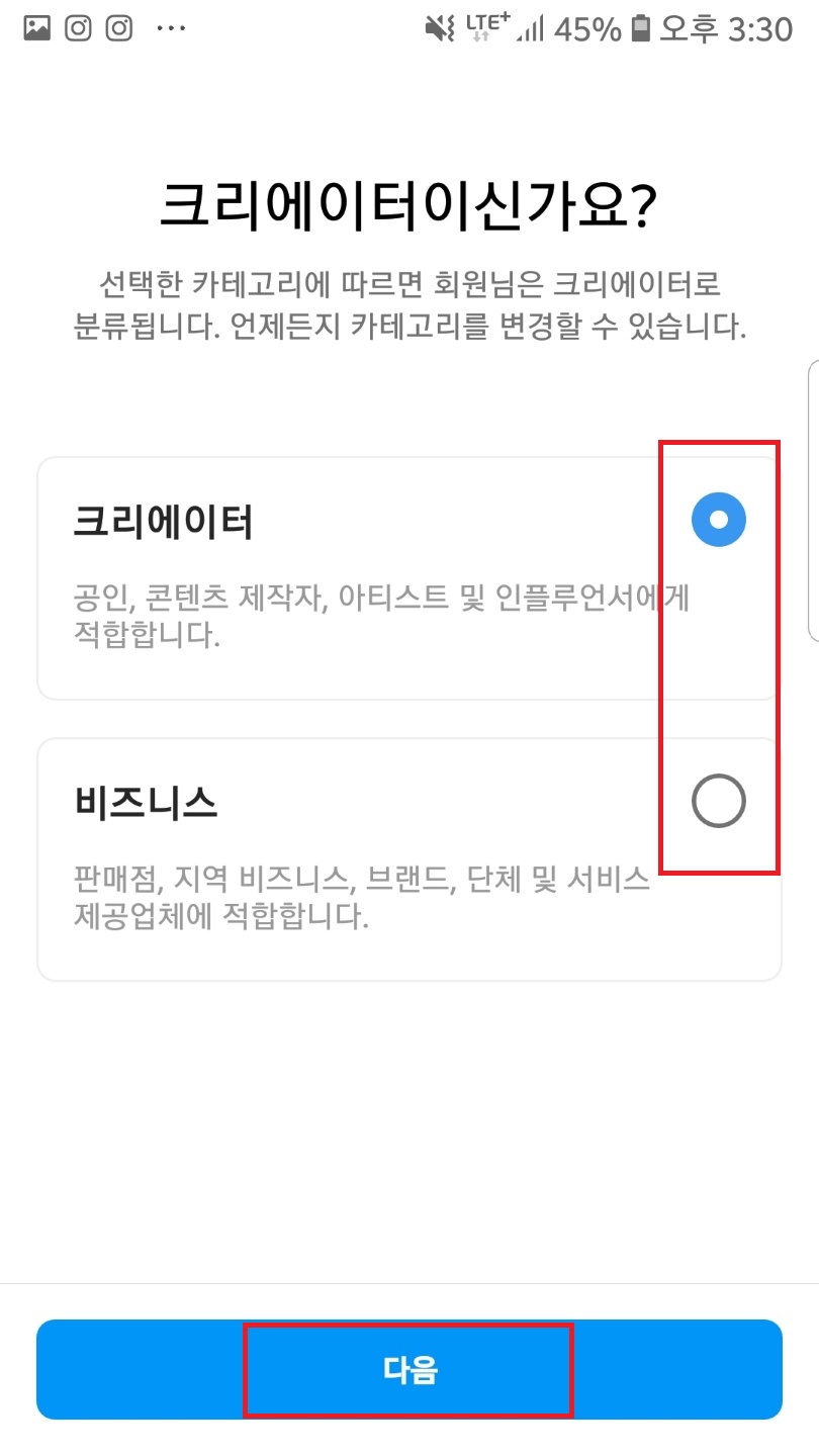 크리에이터와 비즈니스 계정 중에 선택하시고 다음을 누른 후 X를 눌러주시면 직업 추가가 된 걸 보실 수 있어요!